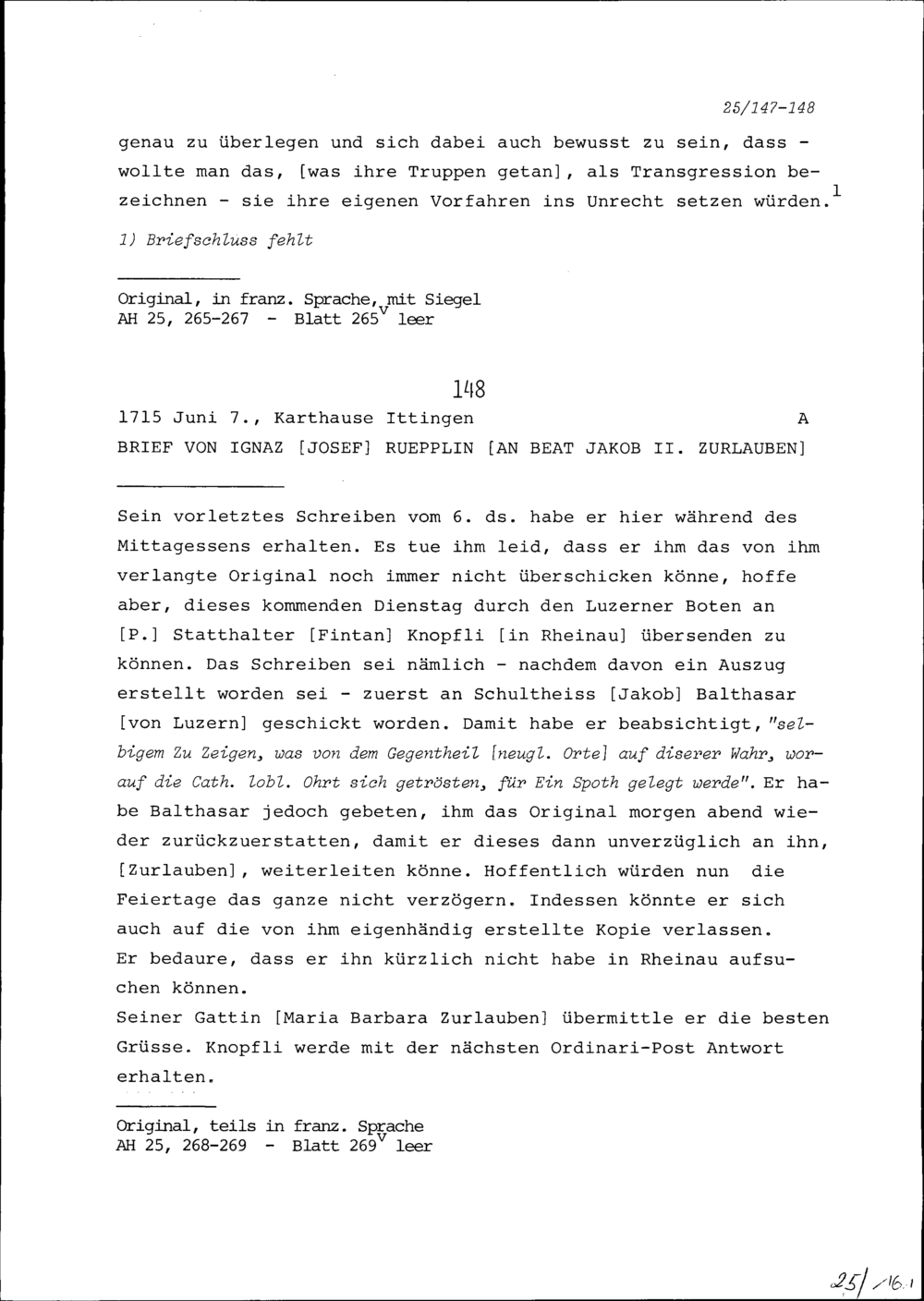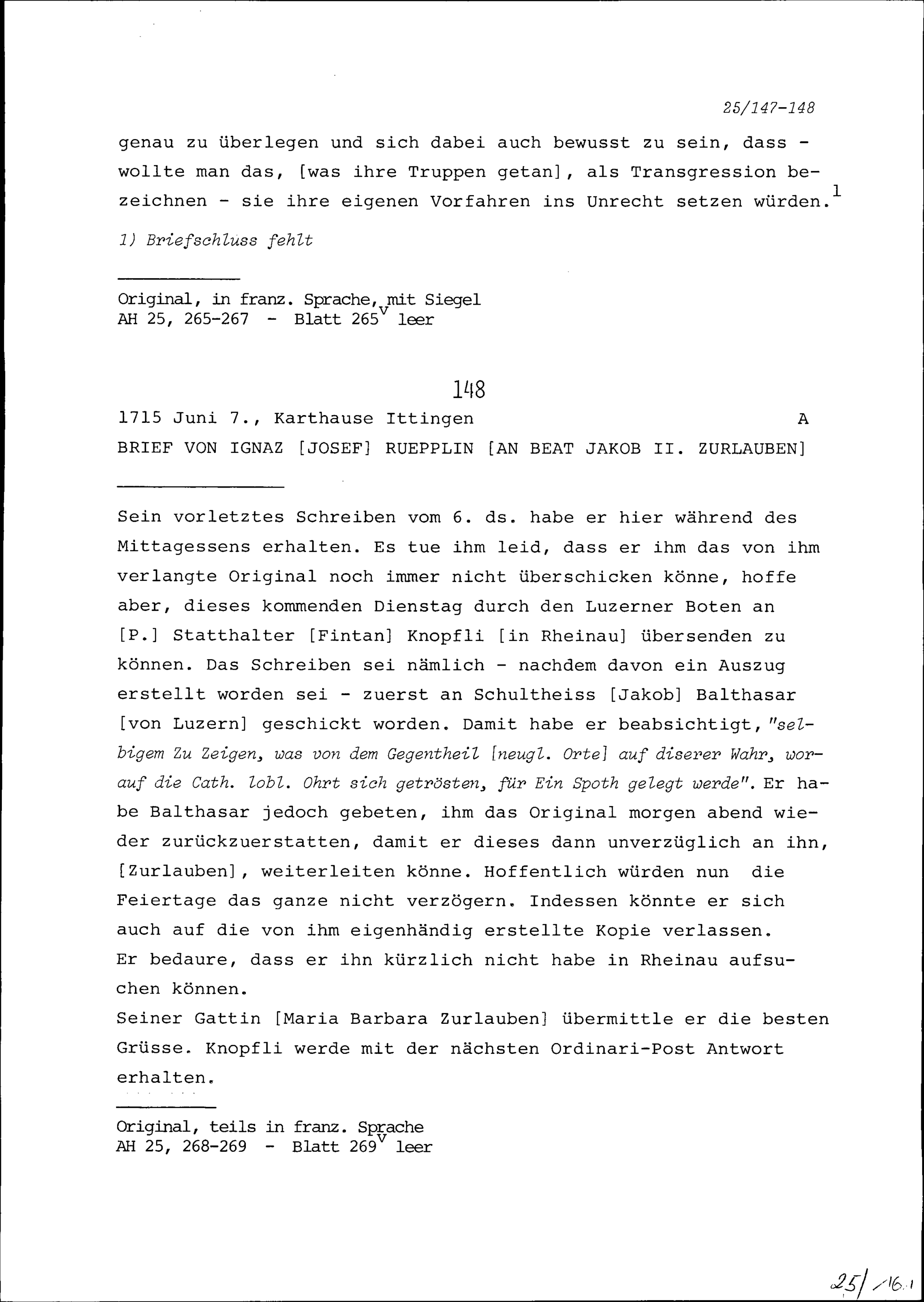 Schreiben von Ignaz Josef Rüpplin an Beat Jakob II. Zurlauben
