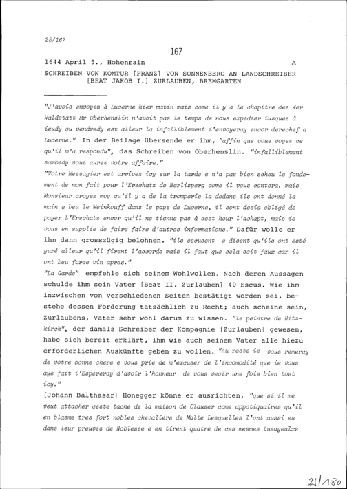 Schreiben von Franz von Sonnenberg, Komtur, an Beat Jakob I. Zurlauben, Landschreiber, Bremgarten
