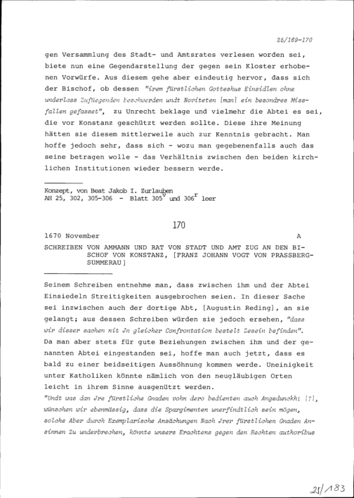 Schreiben des Ammanns und Rats von Stadt und Amt Zug an Franz Johann Vogt von Prassberg-Summerau, Bischof von Konstanz