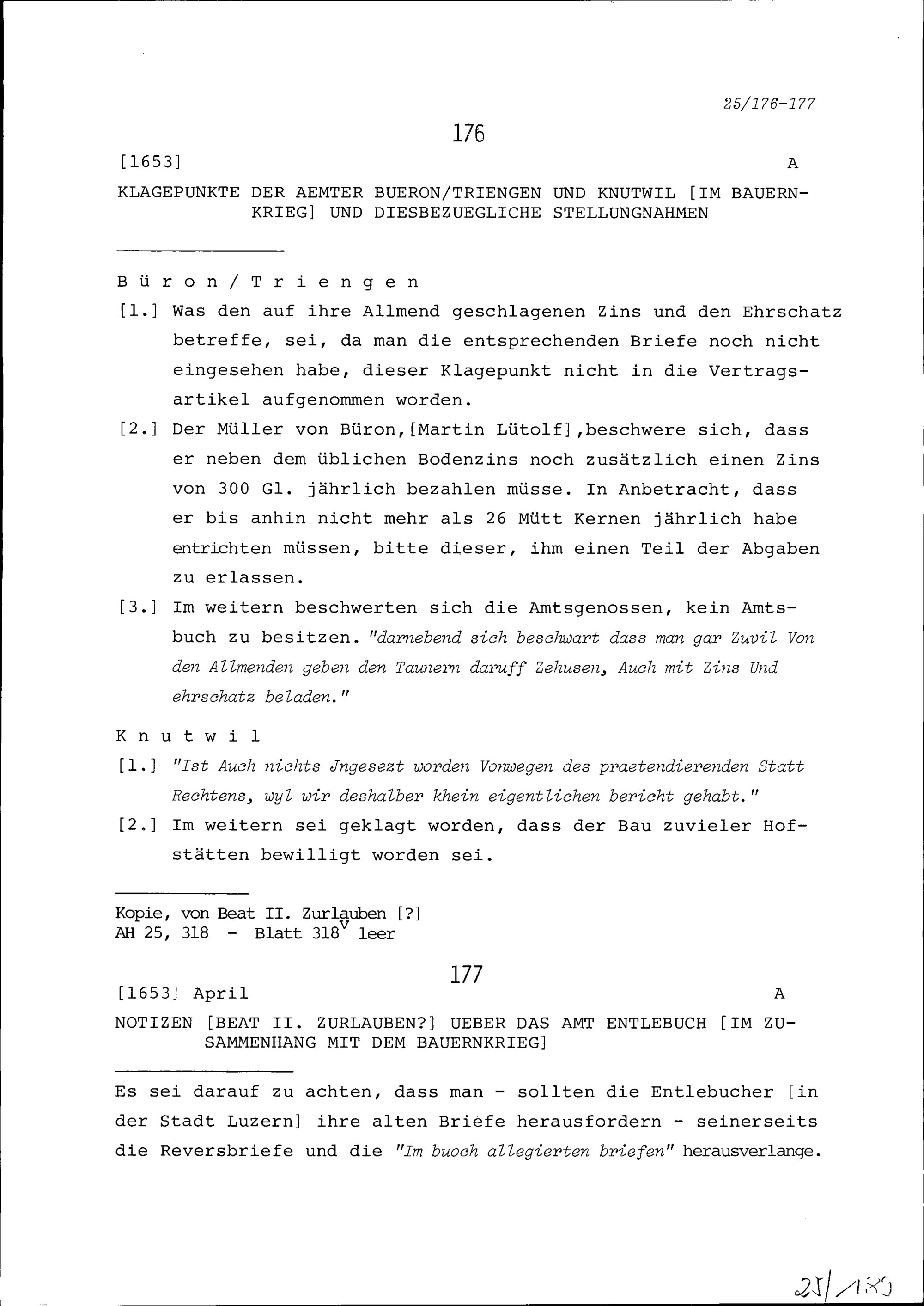 Klagen der Ämter Büron-Triengen und Knutwil im Bauernkrieg und diesbezügliche St...