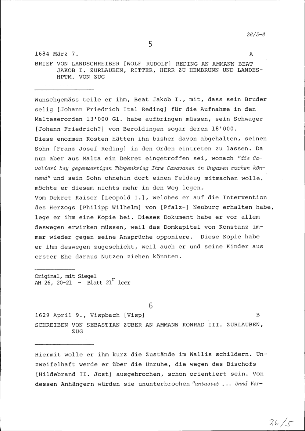 Schreiben von Wolf Rudolf Reding, Landschreiber, an Beat Jakob I. Zurlauben, Ammann, Herr zu Hembrunn und Landeshauptmann von Zug
