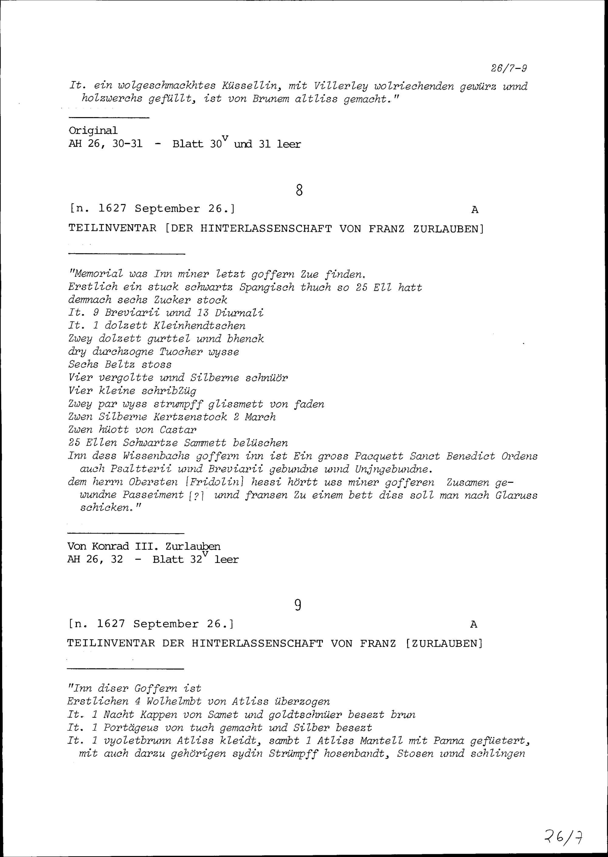 Teilinventar der Hinterlassenschaft von Franz Zurlauben