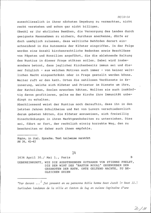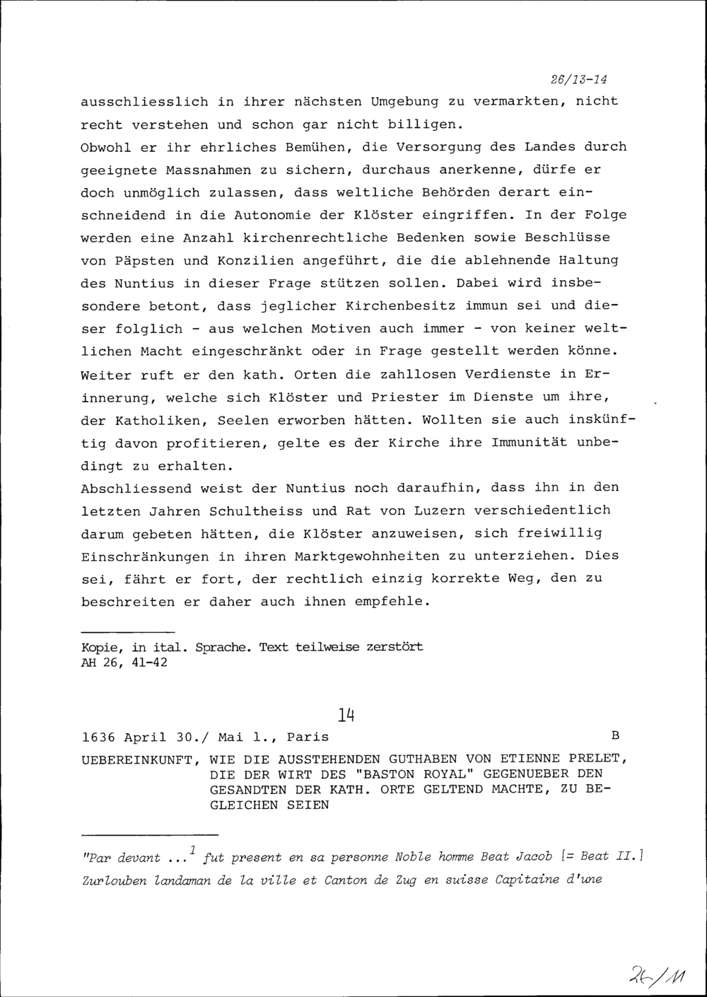 Übereinkunft, wie die ausstehenden Guthaben von Etienne Prelet, die der Wirt des Baston Royal gegenüber den Gesandten der Katholischen Orte geltend machte, zu begleichen seien