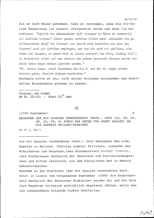 Begehren der mit Spanien verbündeten Katholischen Orte Luzern, Uri, Schwyz, Unterwalden (Ob- und Nidwalden), Zug, Freiburg und Appenzell-Innerrhoden sowie des Abtes von Sankt Gallen an die Adresse Mailand-Spaniens