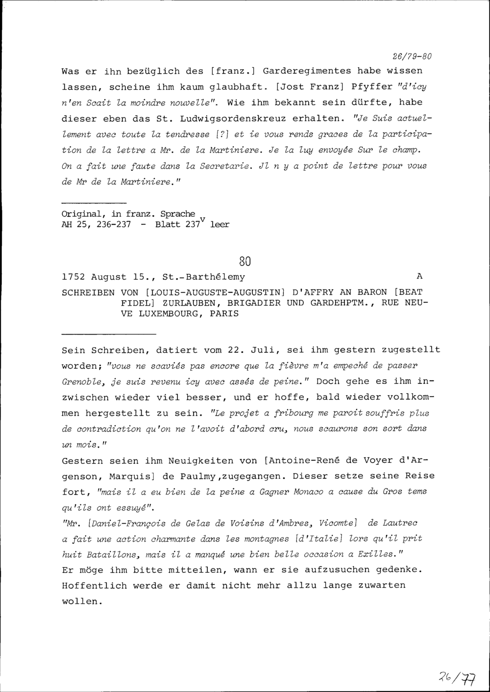 Schreiben von Louis-Auguste-Augustin d'Affry an Beat Fidel Zurlauben, Brigadier und Gardehauptmann, Paris