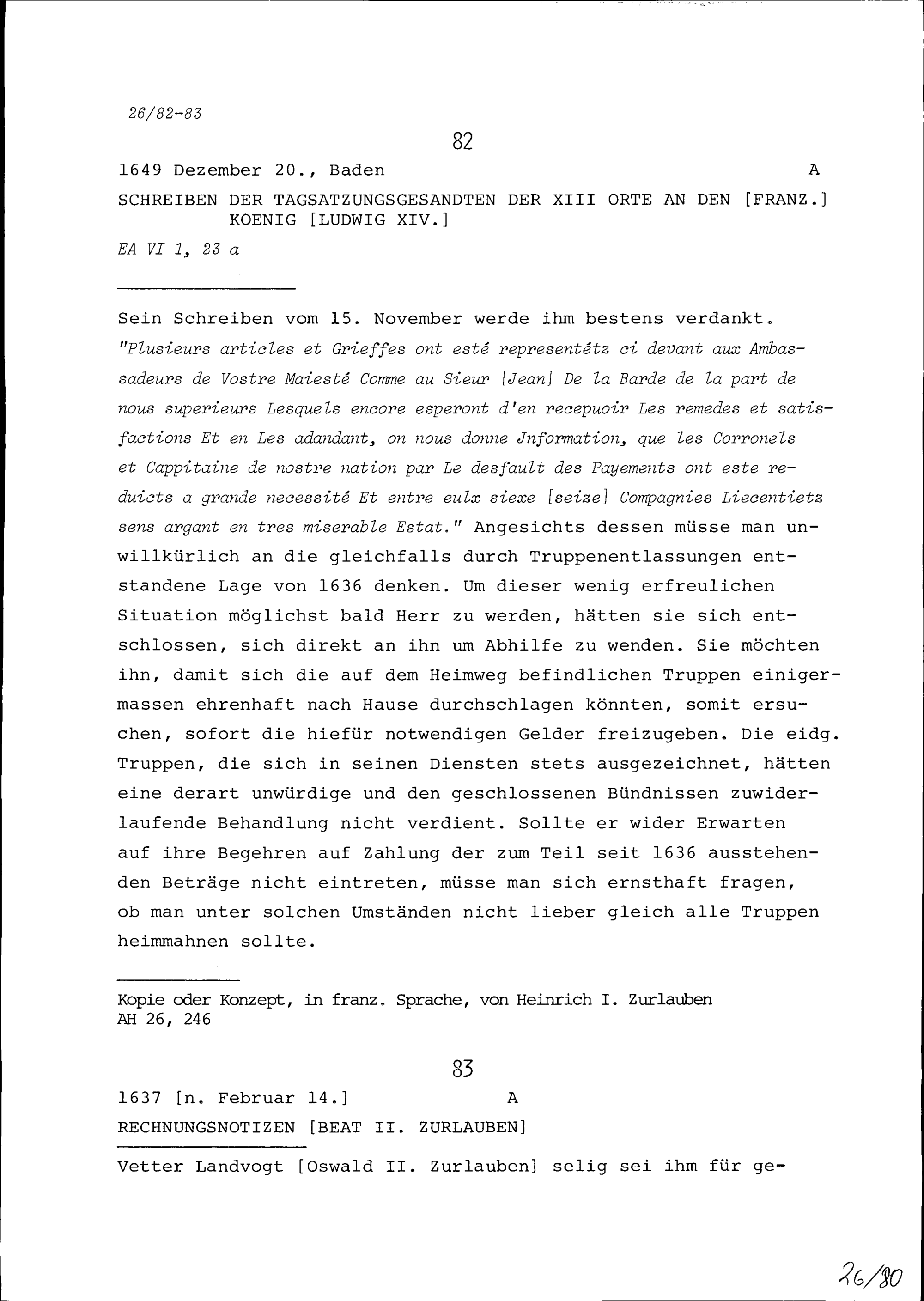 Schreiben der Tagsatzungsgesandten der Dreizehn Orte an Ludwig XIV., König von Frankreich