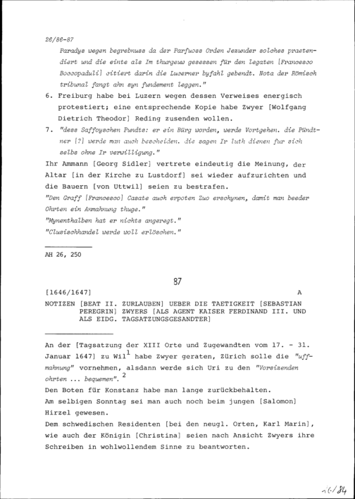 Notiz von Beat II. Zurlauben über die Tätigkeit von Sebastian Peregrin Zwyer als Agent von Ferdinand III., Kaiser, und als Eidgenössischer Tagsatzungsgesandter
