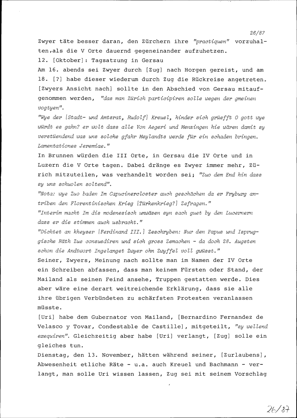 Notiz von Beat II. Zurlauben über die Tätigkeit von Sebastian Peregrin Zwyer als Agent von Ferdinand III., Kaiser, und als Eidgenössischer Tagsatzungsgesandter