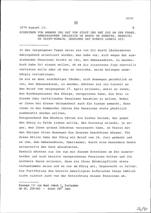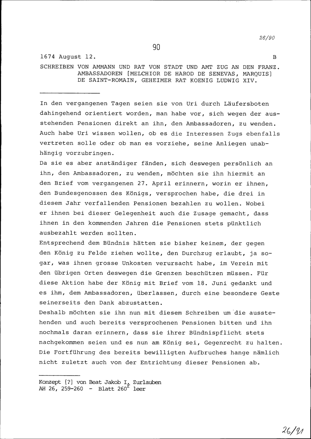 Schreiben des Ammanns und Rats von Stadt und Amt Zug an Melchior de Harod de Senevas, Marquis de Saint-Romain, Ambassador von Frankreich und Geheimer Rat von Ludwig XIV., König von Frankreich,