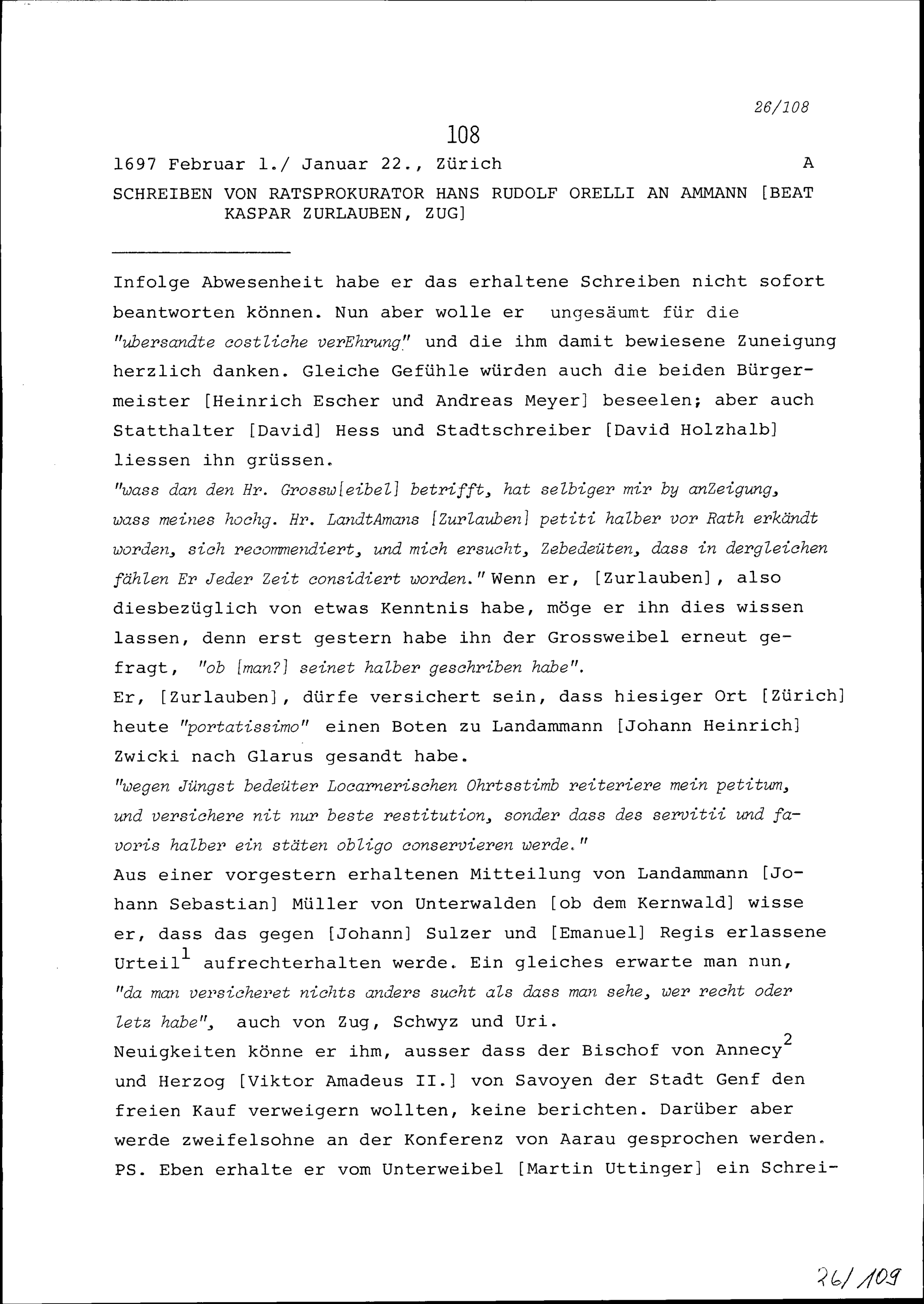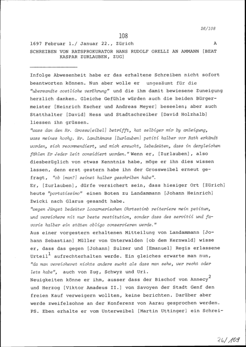 Schreiben von Hans Rudolf Orelli, Ratsprokurator, an Beat Kaspar Zurlauben, Ammann, Zug