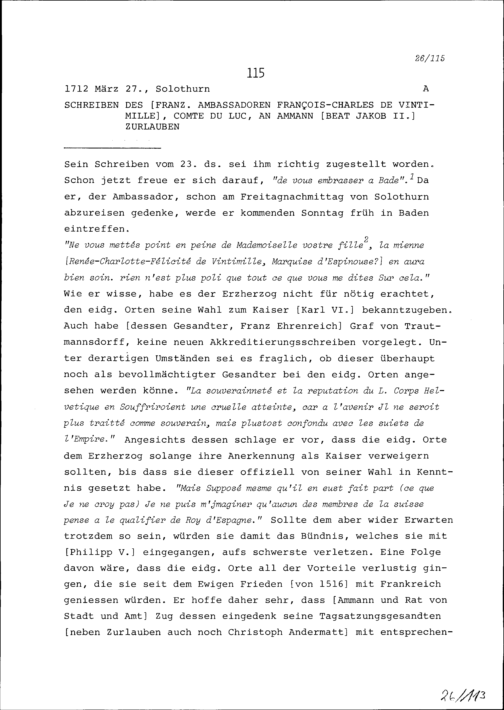 Schreiben von François-Charles de Vintimille, Graf du Luc, Ambassador von Frankreich, an Beat Jakob II. Zurlauben, Ammann