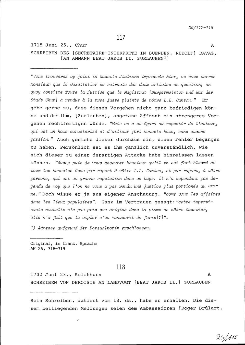Schreiben von Rudolf Davaz, Dolmetscher in Bünden, an Beat Jakob II. Zurlauben, Ammann