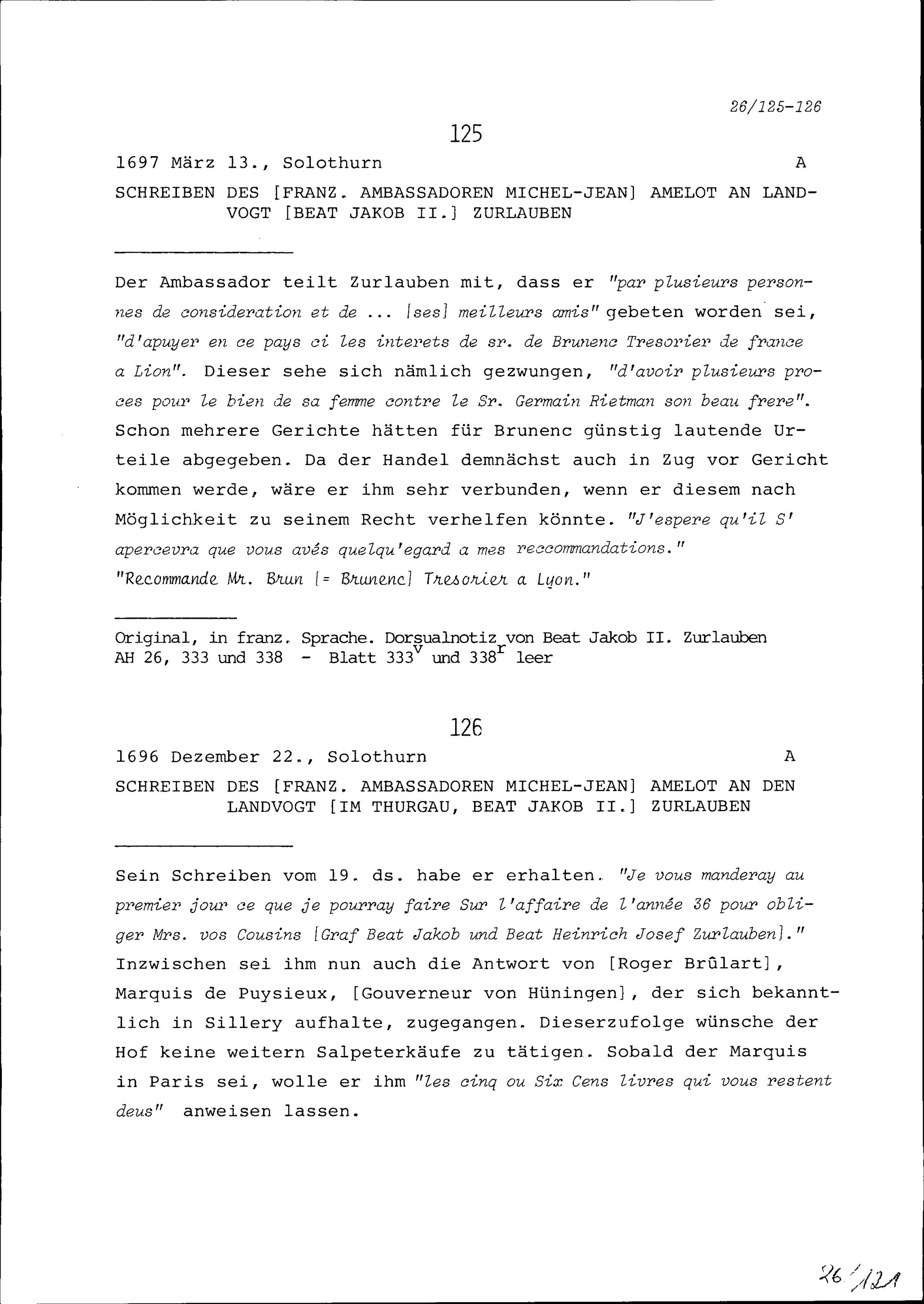 Schreiben von Michel-Jean Amelot, Ambassador von Frankreich, an Beat Jakob II. Zurlauben, Landvogt