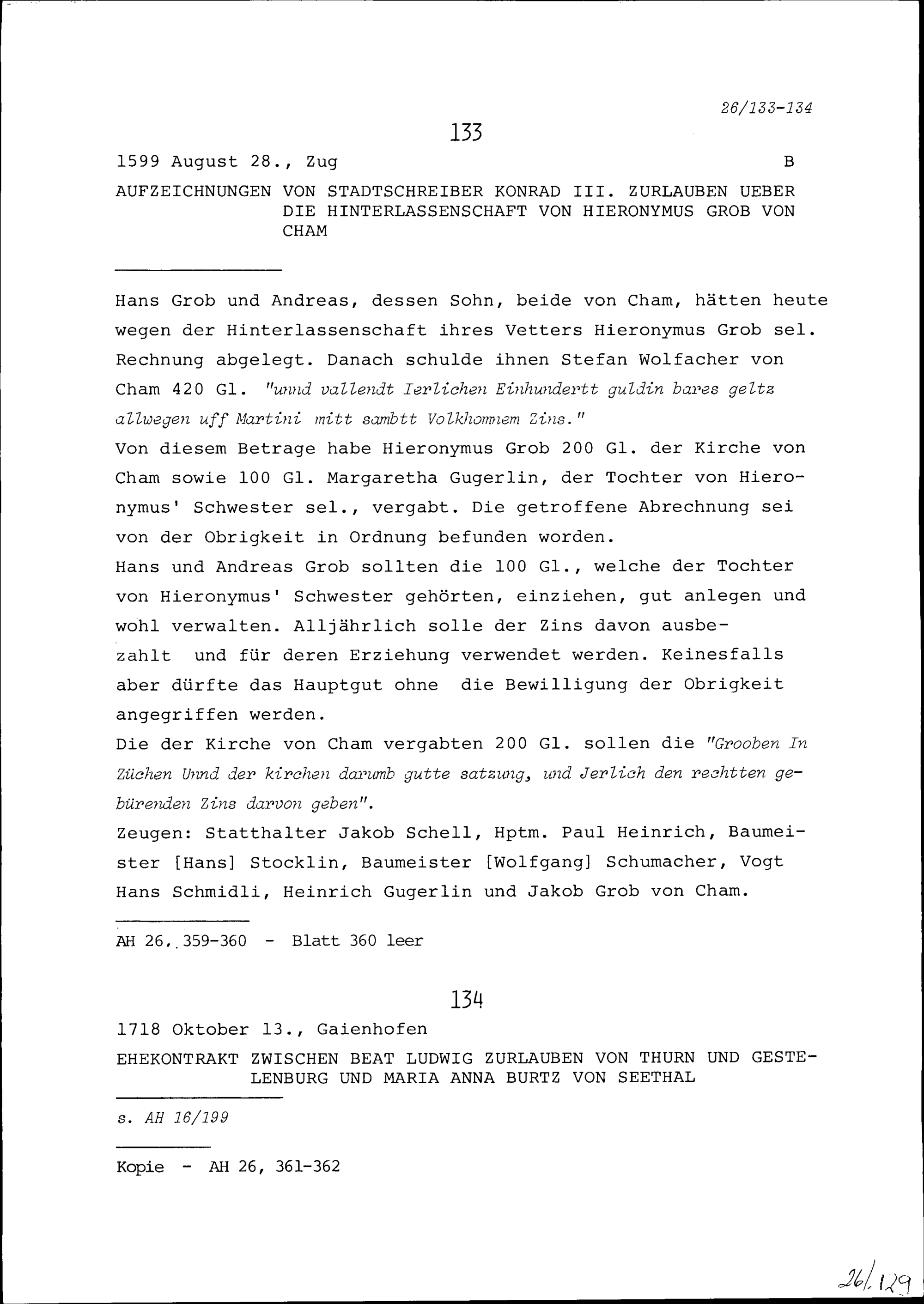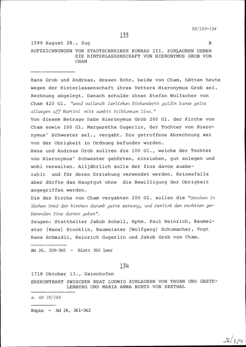 Aufzeichnungen von Konrad III. Zurlauben, Stadtschreiber, über die Hinterlassenschaft von Hieronymus Grob von Cham