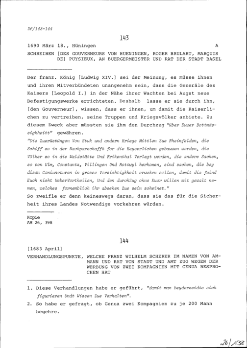 Schreiben von Roger Brûlart, Marquis de Puysieux, Gouverneur von Hüningen, an Bürgermeister...