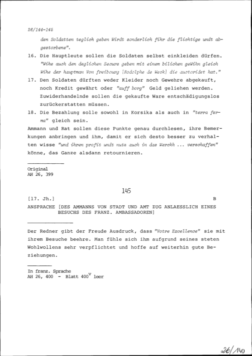 Ansprache des Ammanns von Stadt und Amt Zug anlässlich eines Besuchs des Ambassadors von Frankreich