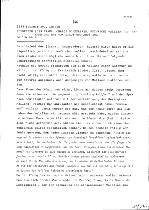 Schreiben von Heinrich Wallier, französischer Geschäftsträger (Charge d'affaires) an Ammann und Rat von Stadt und Amt Zug