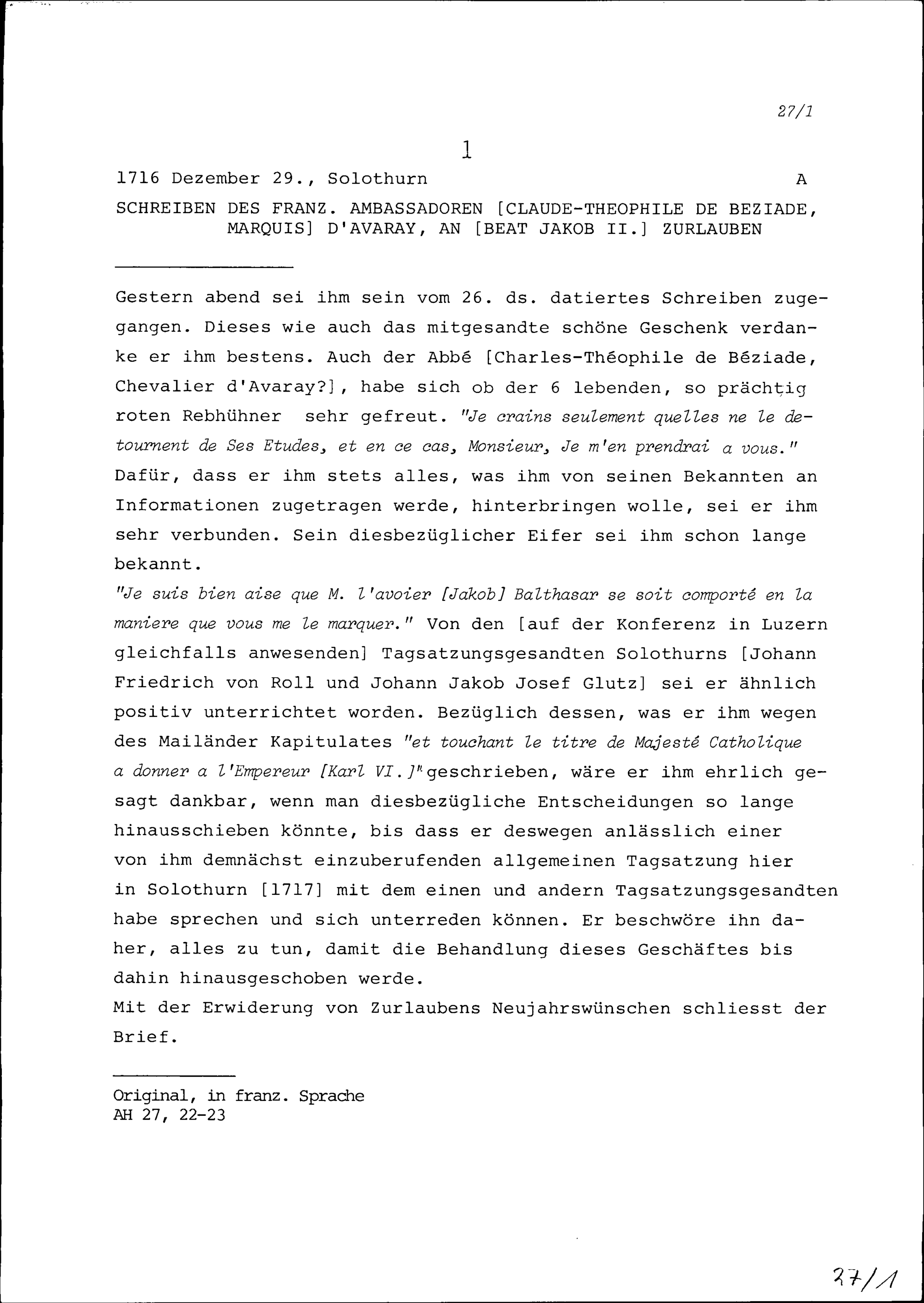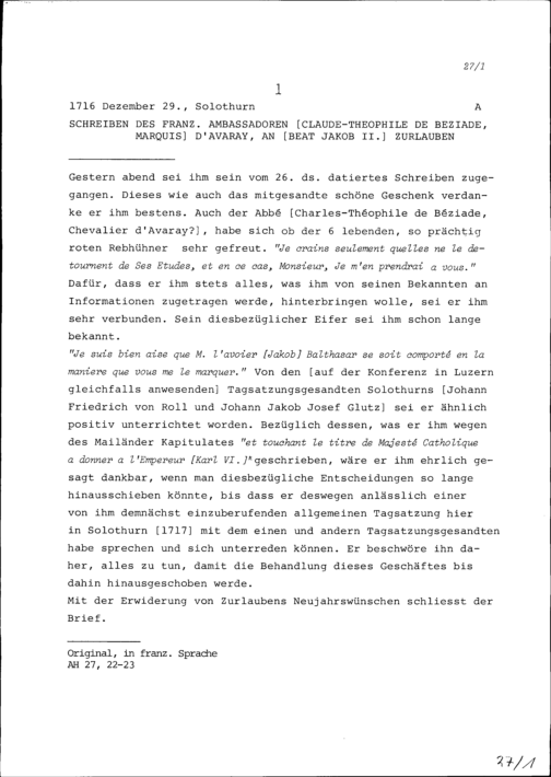 Schreiben von Claude-Théophile de Béziade, Marquis d'Avaray, Ambassador von Frankreich, an Beat Jakob II. Zurlauben