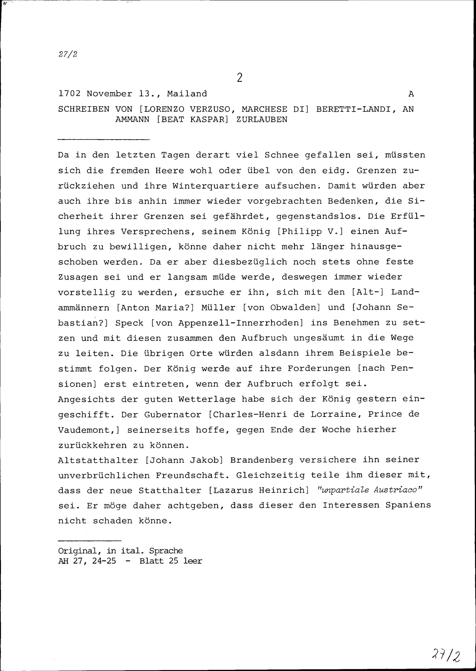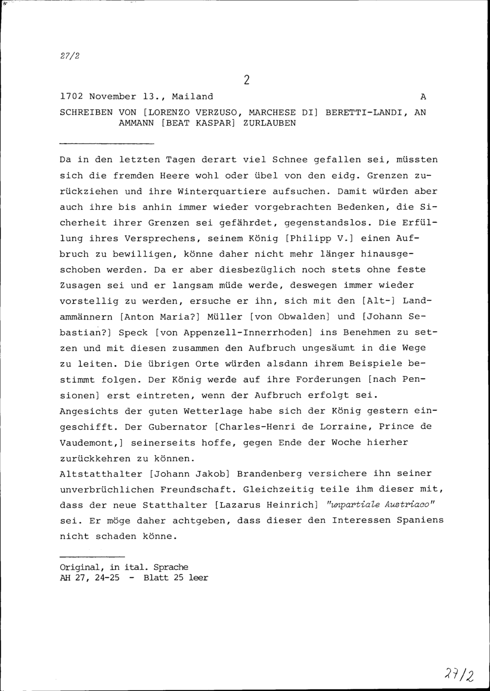 Schreiben von Lorenzo Verzuso, Marchese di Beretti-Landi, an Beat Kaspar Zurlauben, Ammann