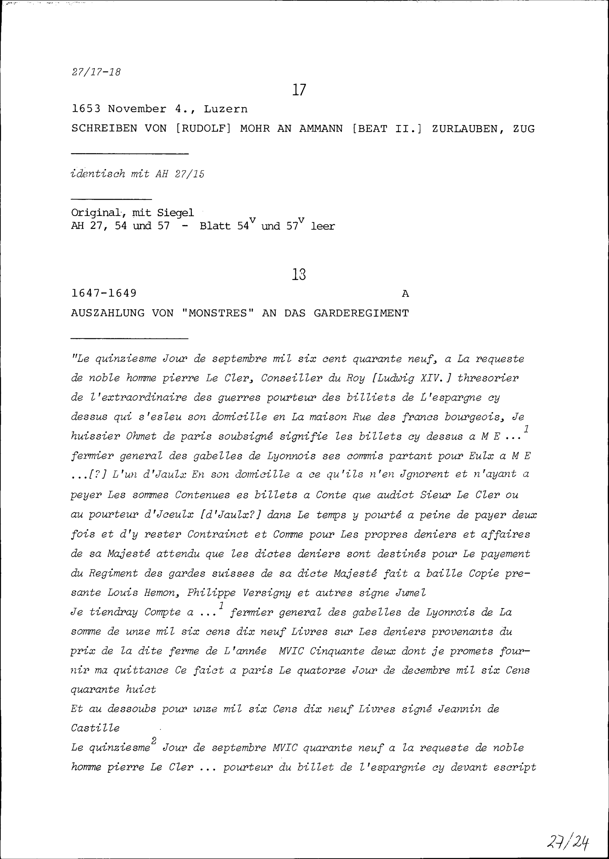 Schreiben von Rudolf Mohr an Beat II. Zurlauben, Ammann, Zug