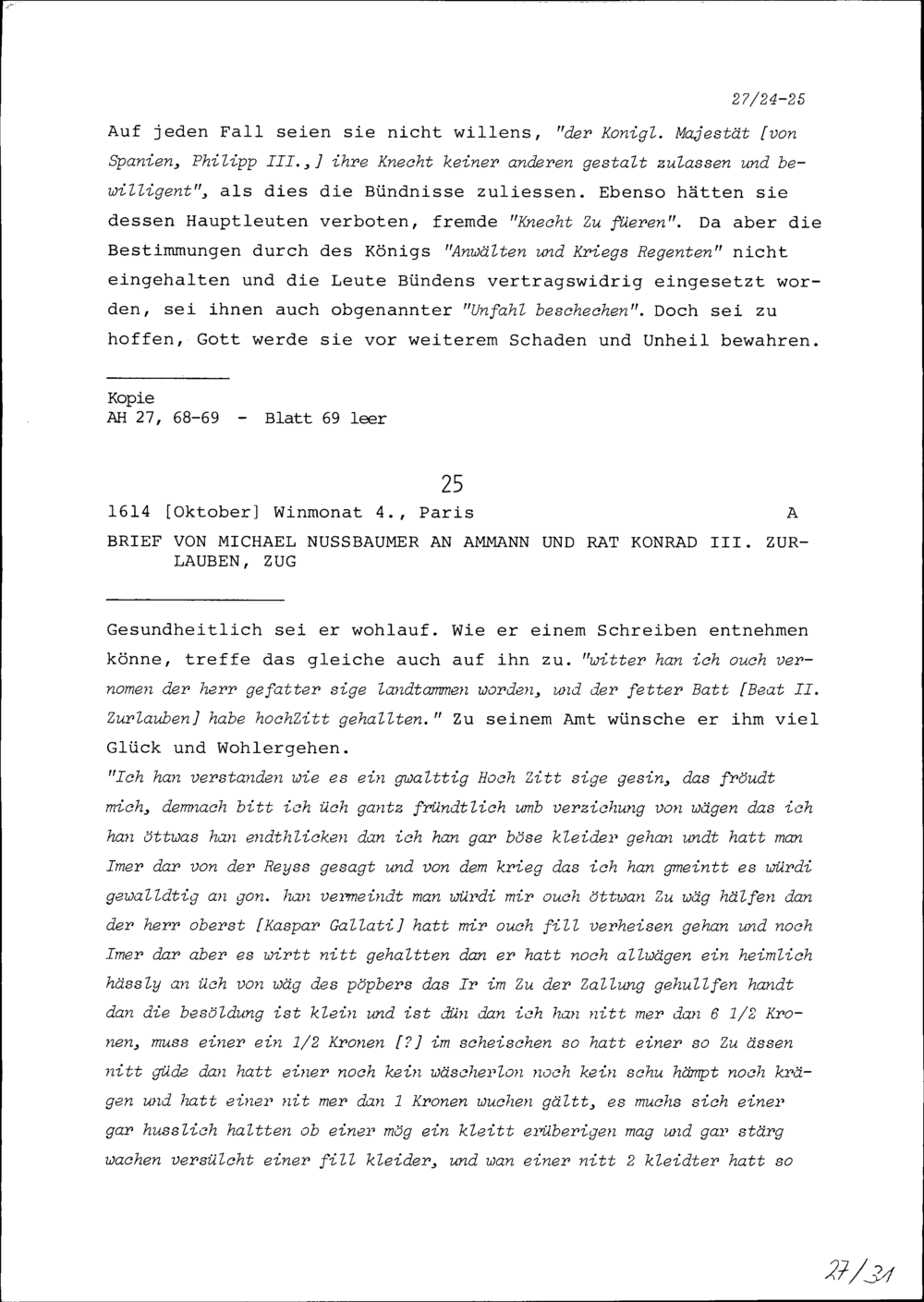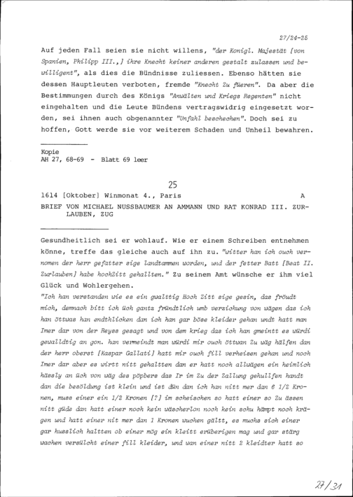 Schreiben von Michael Nussbaumer an Konrad III. Zurlauben, Ammann und Rat, Zug