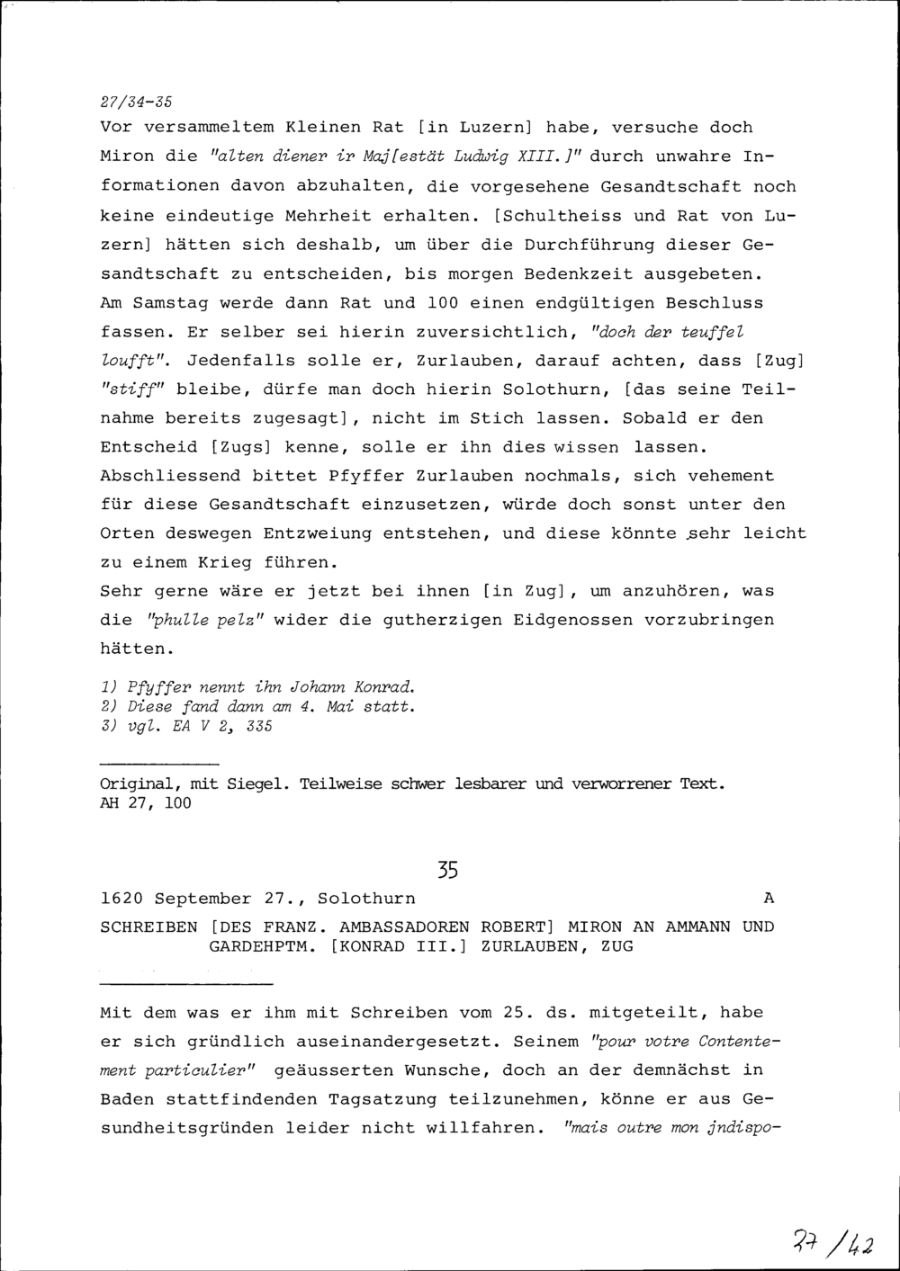 Schreiben von Robert Miron, Ambassador von Frankreich, an Konrad III. Zurlauben,...