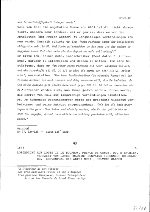 Lobgedicht auf Louis II. de Bourbon, Prince de Conde, Duc d'Enghien, verfasst von Martin Brunner (Fontaine) von Solothurn, Benediktinerpater der Abtei Muri