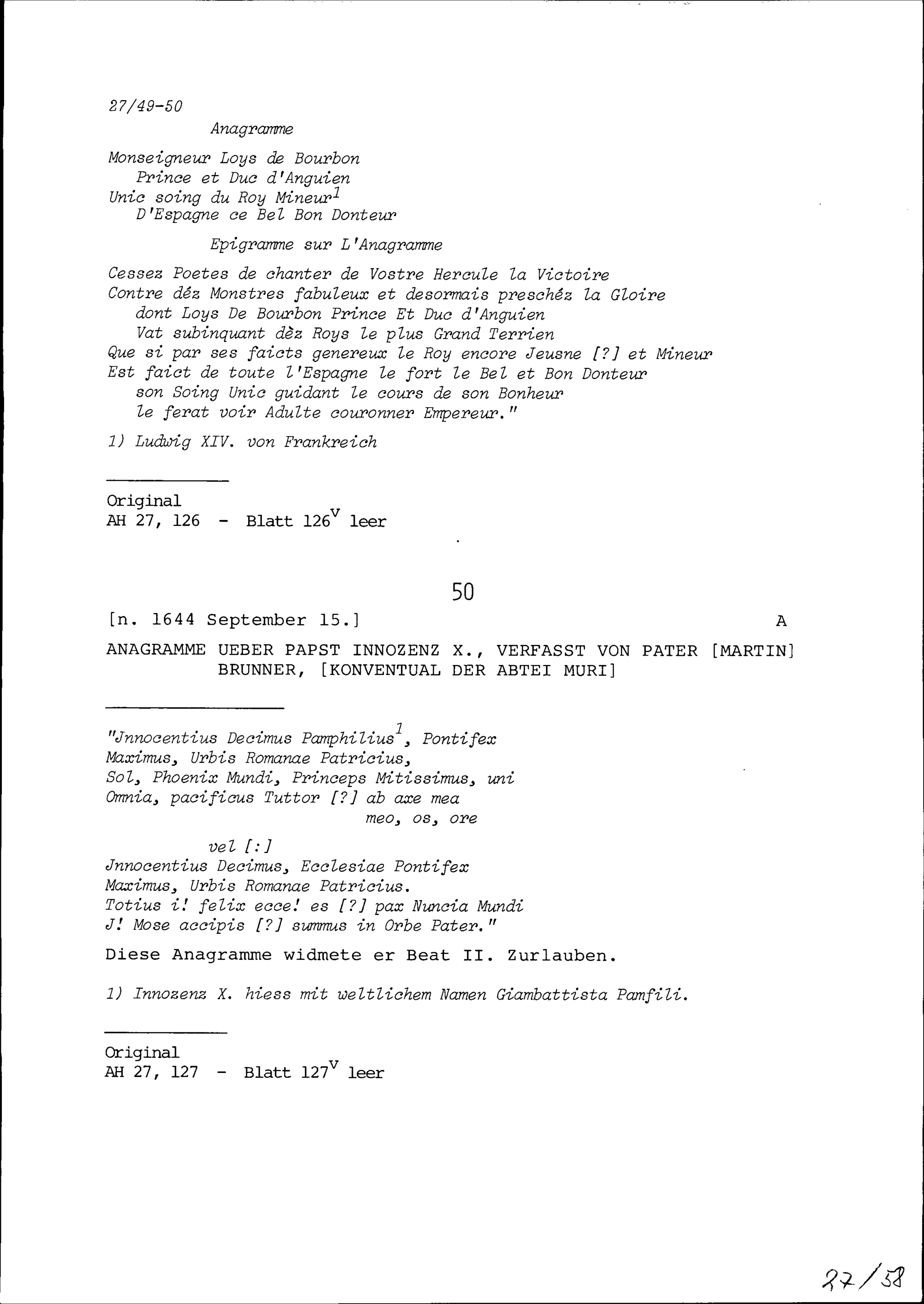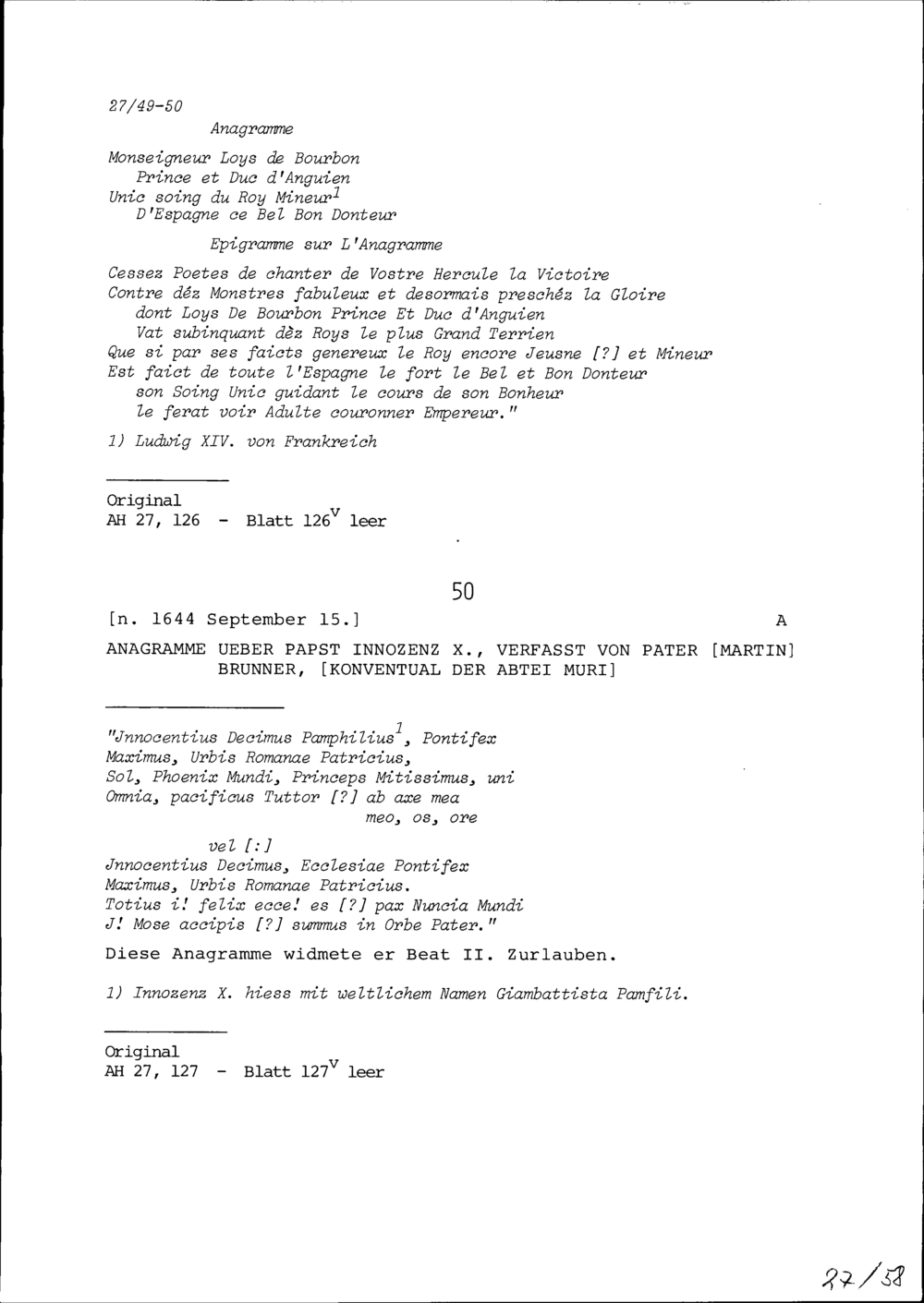 Anagramme über Innozenz X., Papst, verfasst von Martin Brunner, Benediktinerpater der Abtei Muri