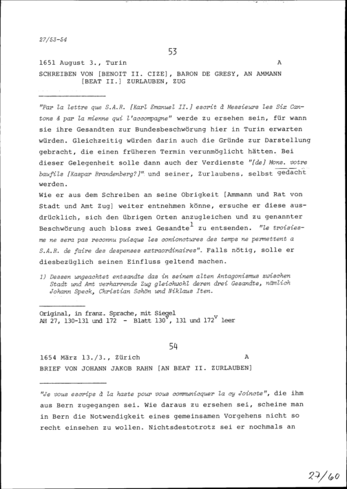Schreiben von Benoît II. Cize, Baron de Grésy, an Beat II. Zurlauben, Ammann, Zu...