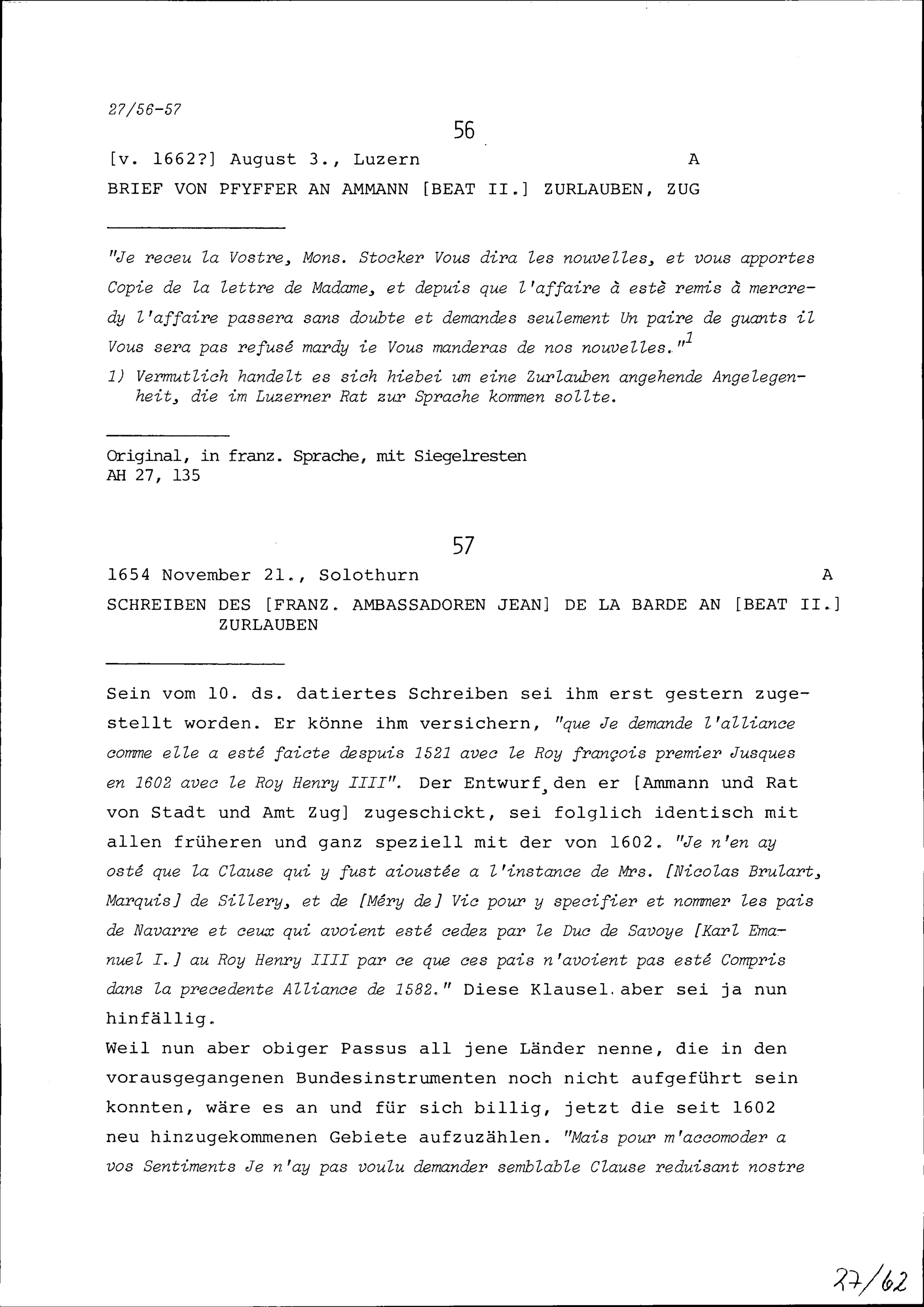 Schreiben von NN Pfyffer an Beat II. Zurlauben, Ammann, Zug