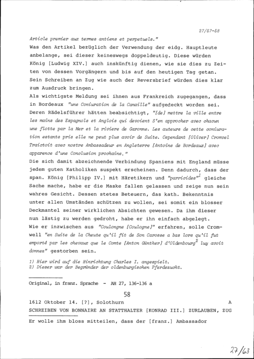 Schreiben von NN Bonnaire an Konrad III. Zurlauben, Statthalter, Zug