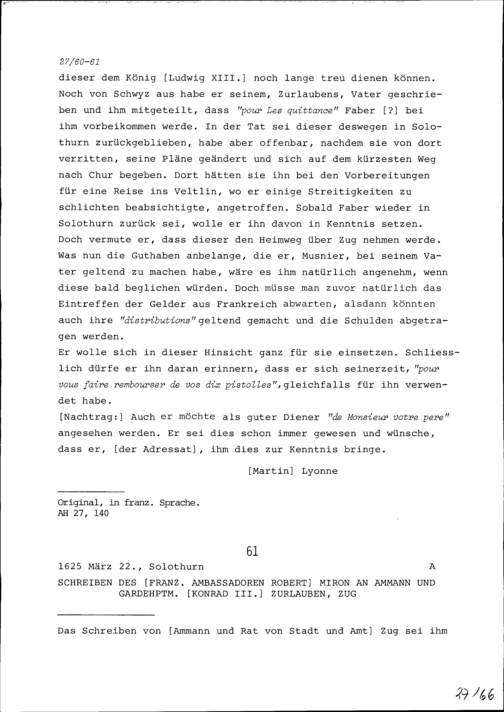 Schreiben von Robert Miron, Ambassador von Frankreich, an Konrad III. Zurlauben, Ammann und Gardehauptmann, Zug