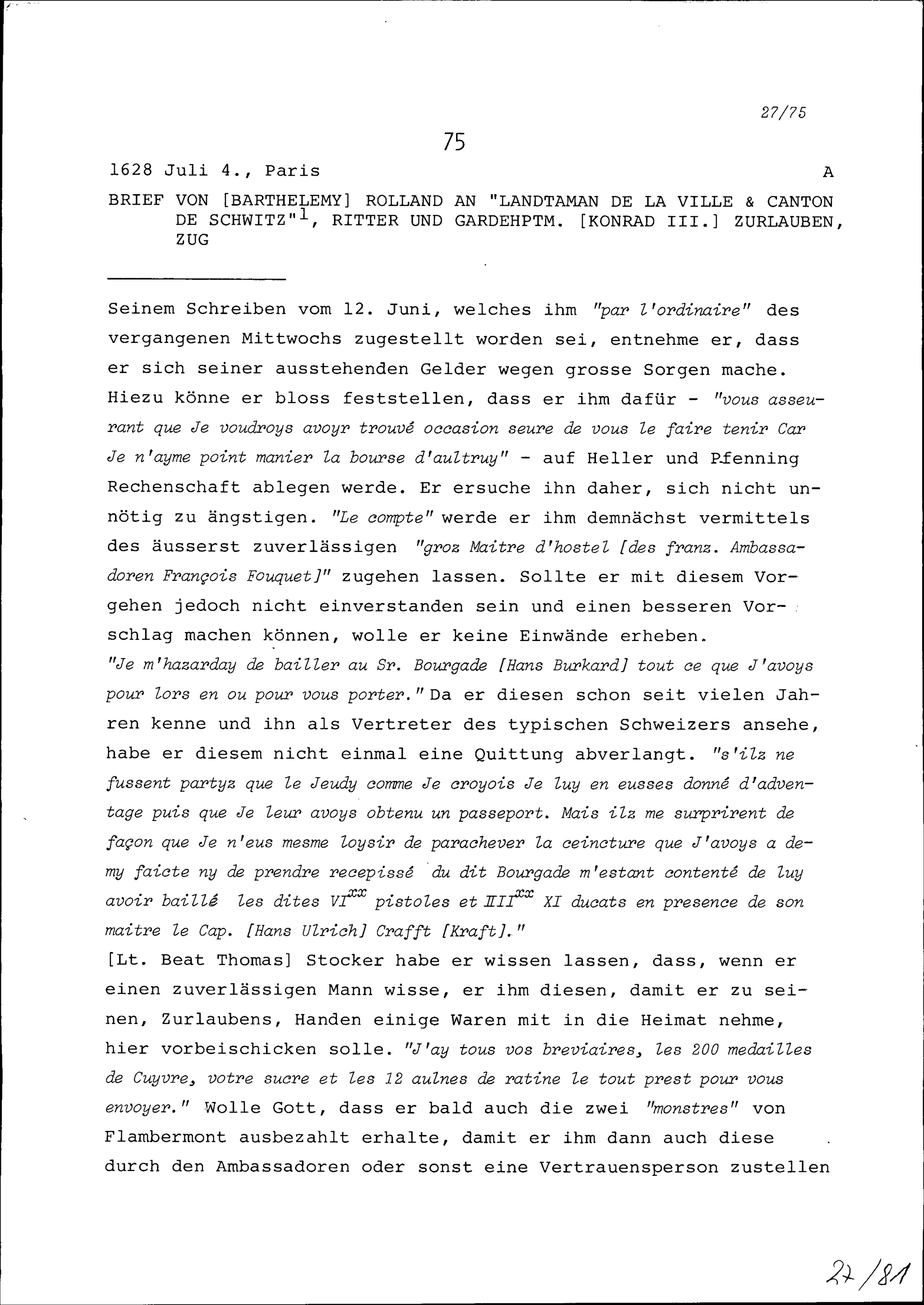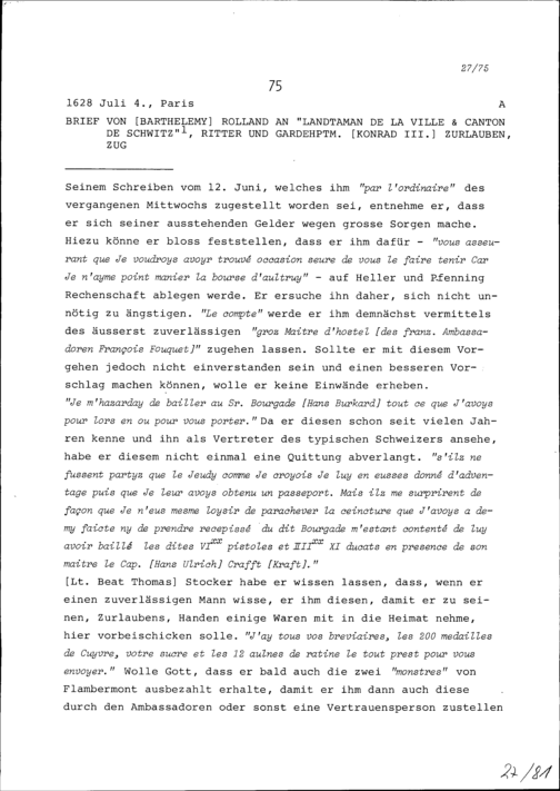 Schreiben von Barthélémy Rolland an Konrad III. Zurlauben, Landammann und Gardehauptmann, Zug