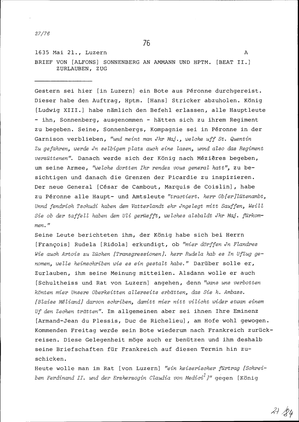 Schreiben von Alfons von Sonnenberg an Beat II. Zurlauben, Ammann und Hauptmann, Zug