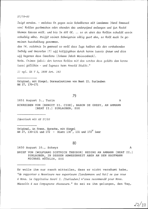 Schreiben von Benoît II. Cize, Baron de Grésy, an Beat II. Zurlauben, Ammann, Zu...