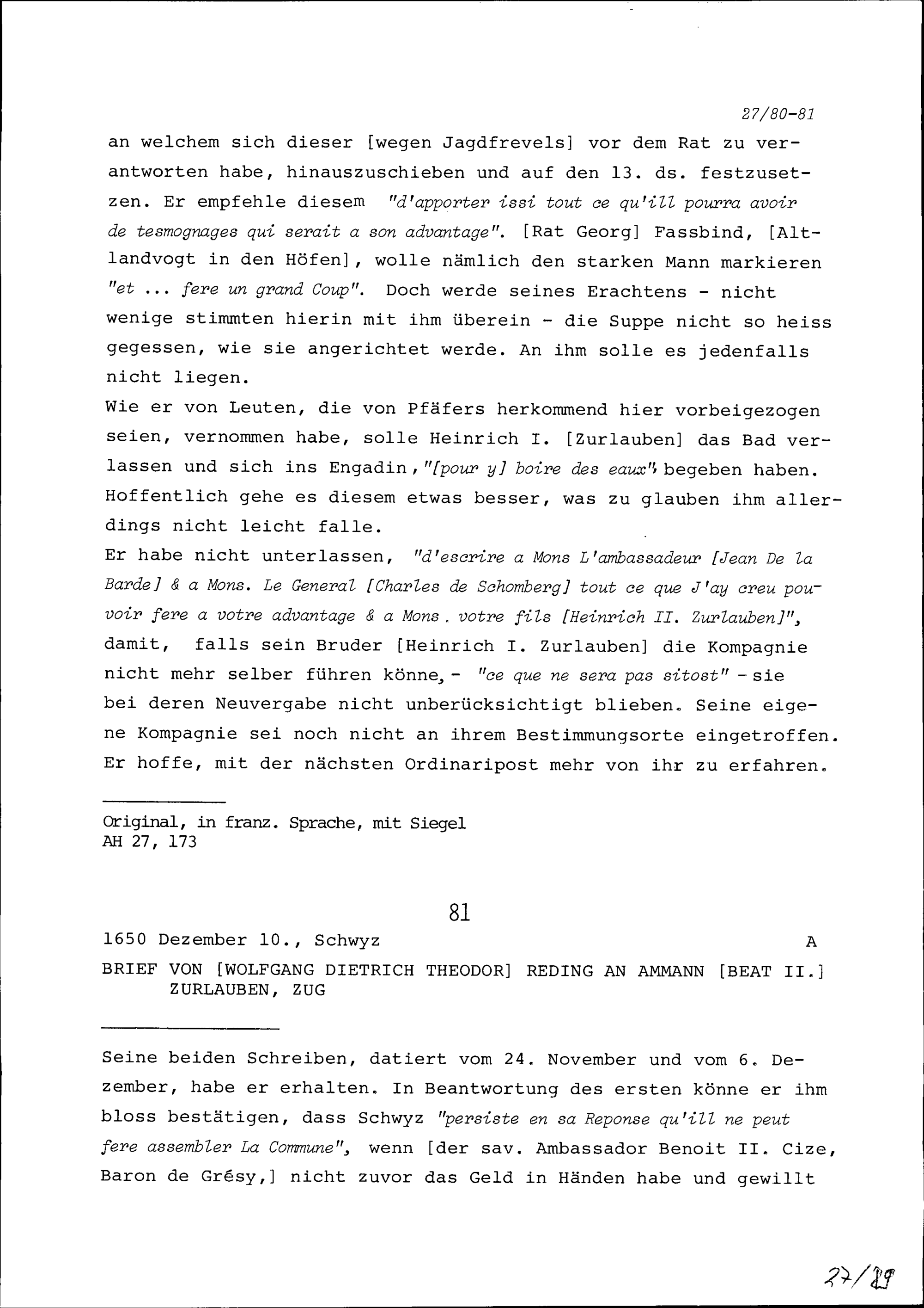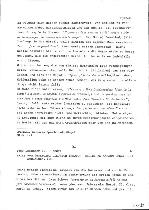 Schreiben von Wolfgang Dietrich Theodor Reding an Beat II. Zurlauben, Ammann, Zu...