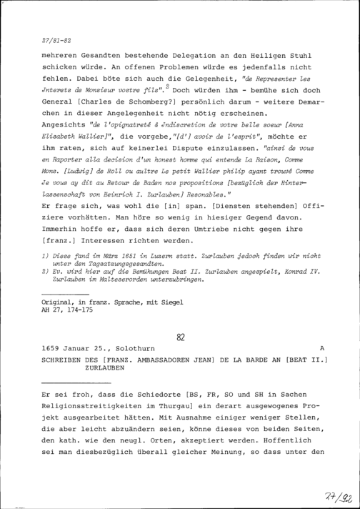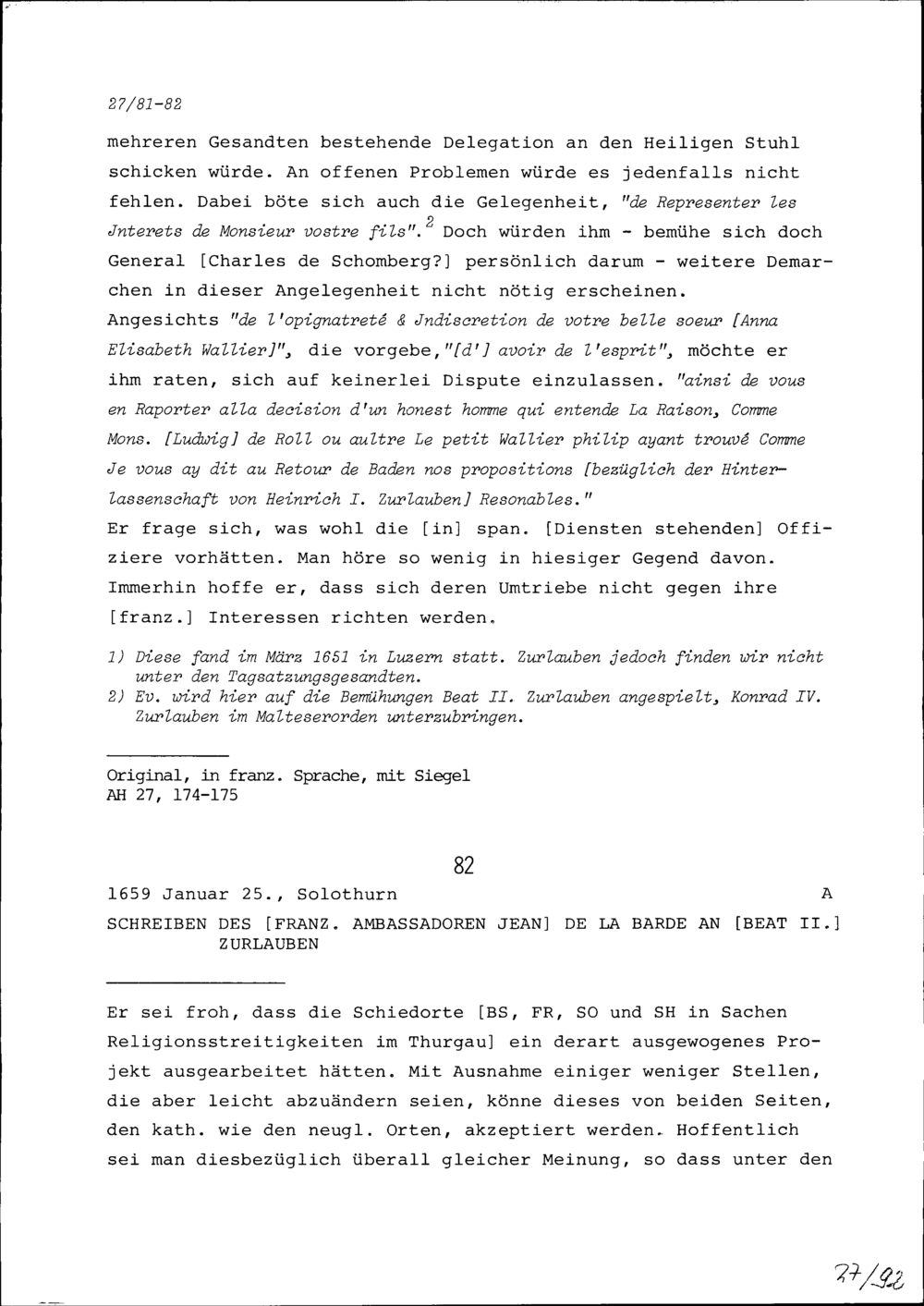 Schreiben von Jean de la Barde, Ambassador von Frankreich, an Beat II. Zurlauben