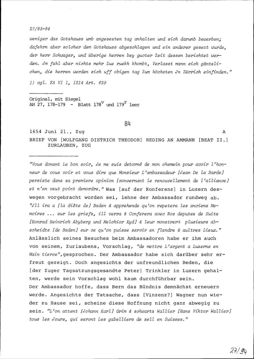 Schreiben von Wolfgang Dietrich Theodor Reding an Beat II. Zurlauben, Ammann, Zug