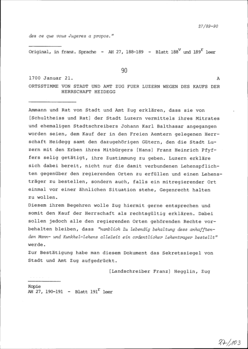 Ortsstimme von Stadt und Amt Zug für Luzern wegen des Kaufs der Herrschaft Heidegg