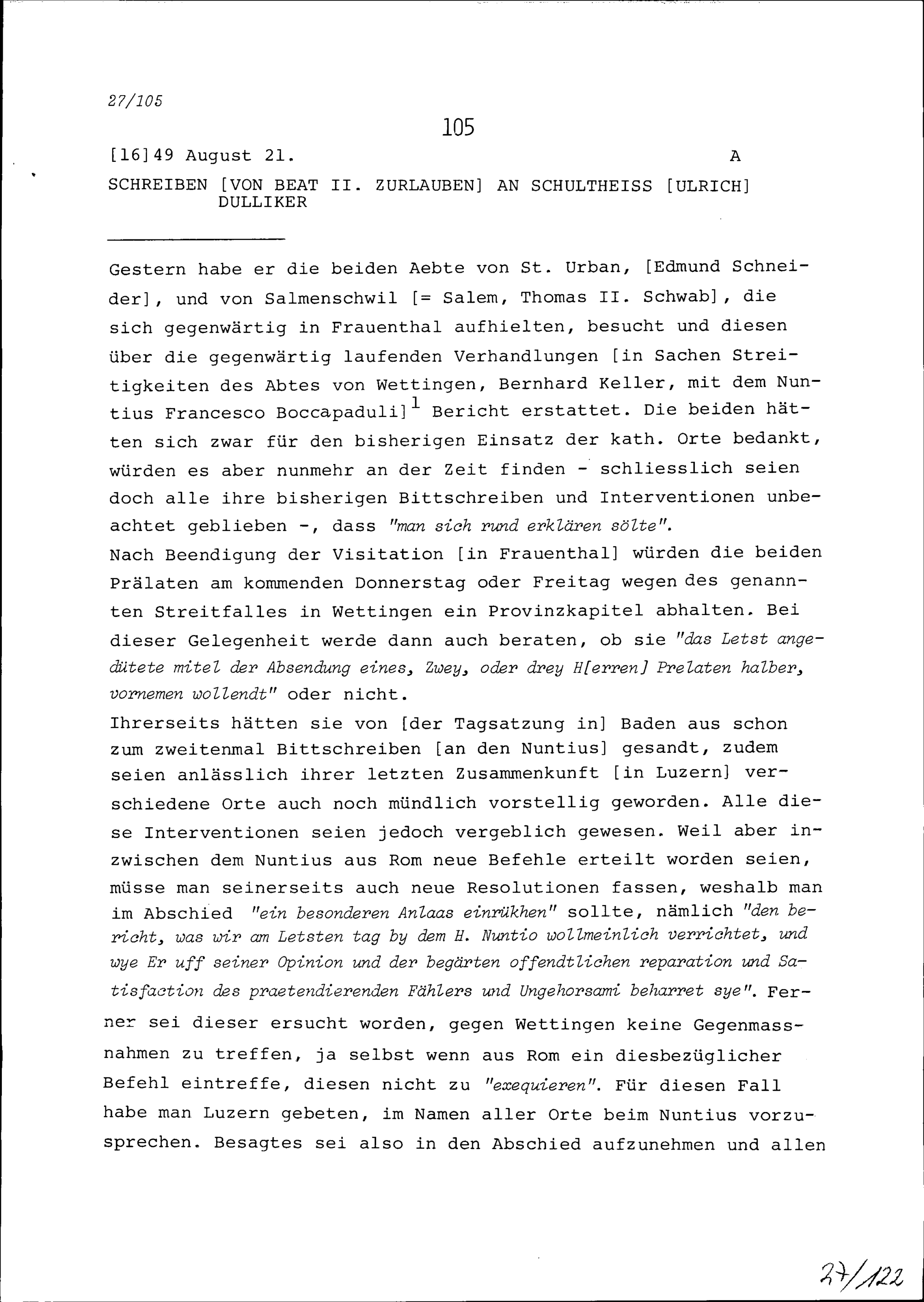 Schreiben von Beat II. Zurlauben an Ulrich Dulliker, Schultheiss