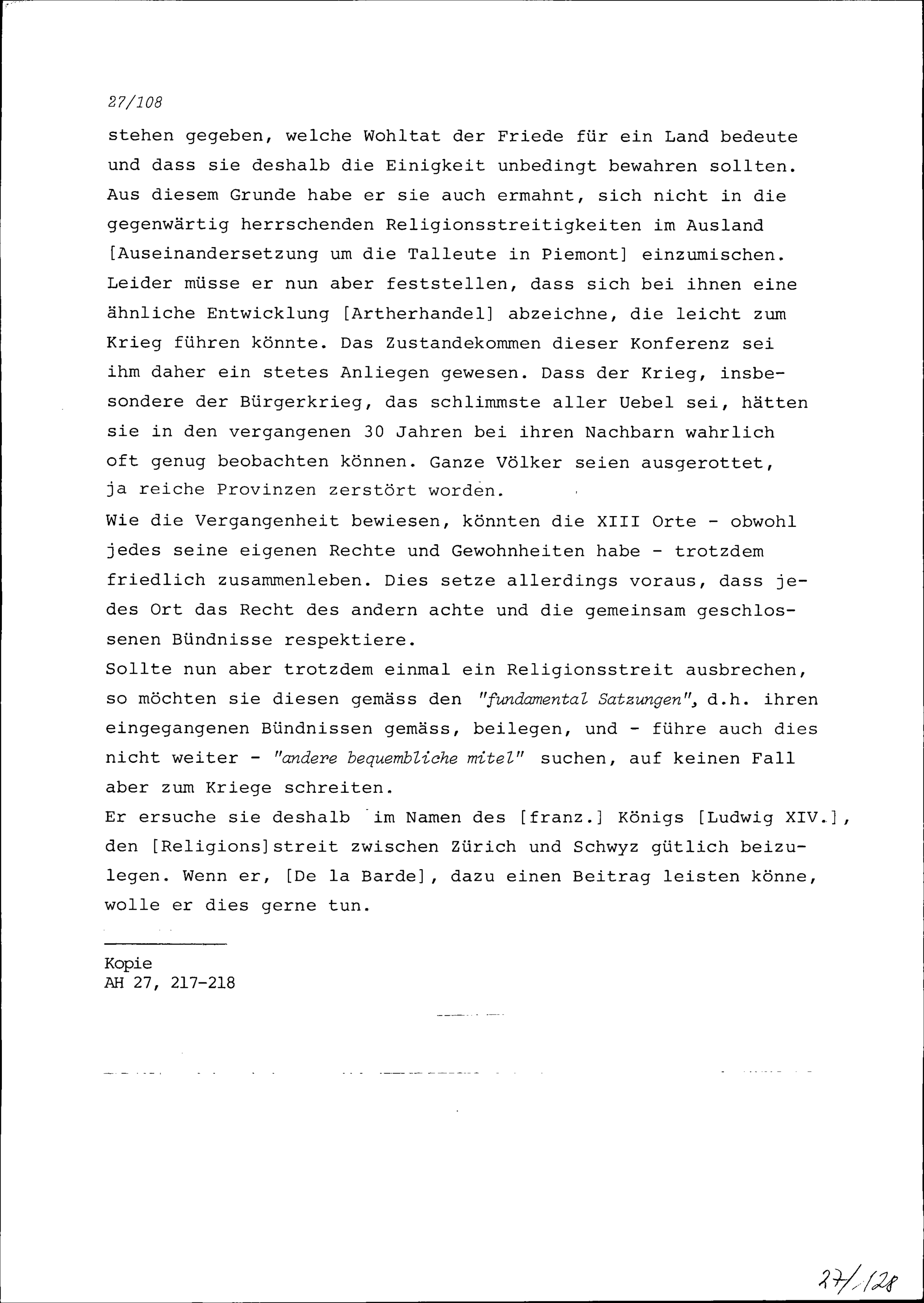 Vortrag von Jean de la Barde, Ambassador von Frankreich, anlässlich der Tagsatzung in Baden