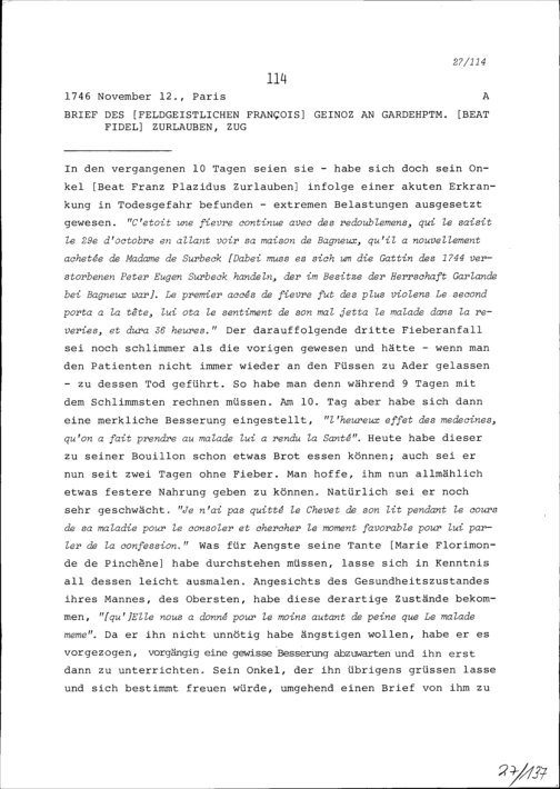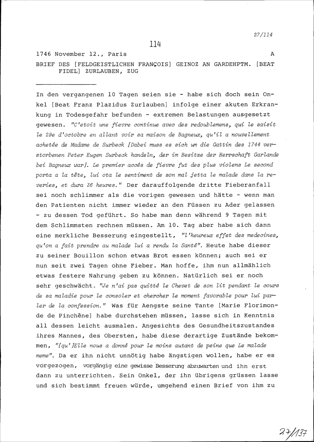 Schreiben von François Geinoz, Feldgeistlicher, an Beat Fidel Zurlauben, Gardehauptmann, Zug