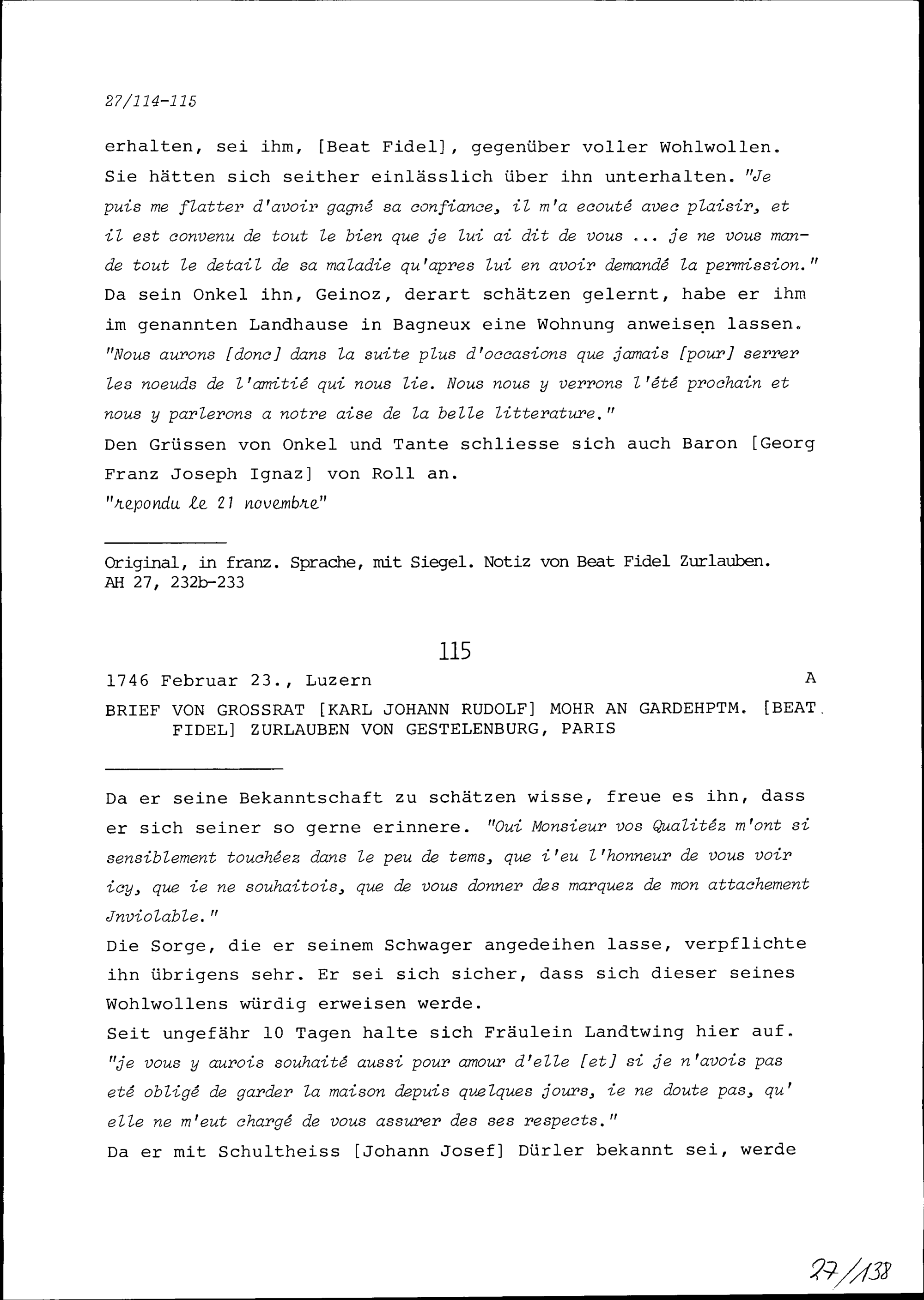Schreiben von Karl Johann Rudolf Mohr, Grossrat, an Beat Fidel Zurlauben, Gardehauptmann, Paris