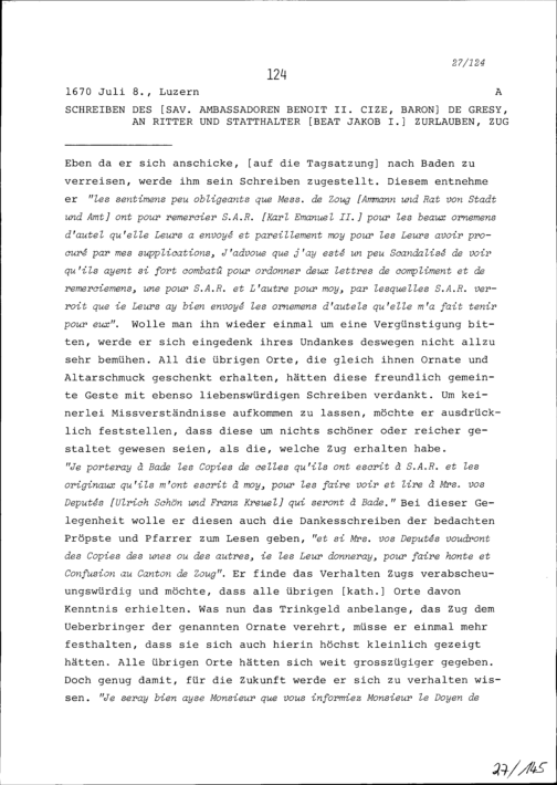 Schreiben von Benoît II. Cize, Baron de Grésy, Ambassador von Frankreich, an Beat Jakob I. Zurlauben, Statthalter, Zug