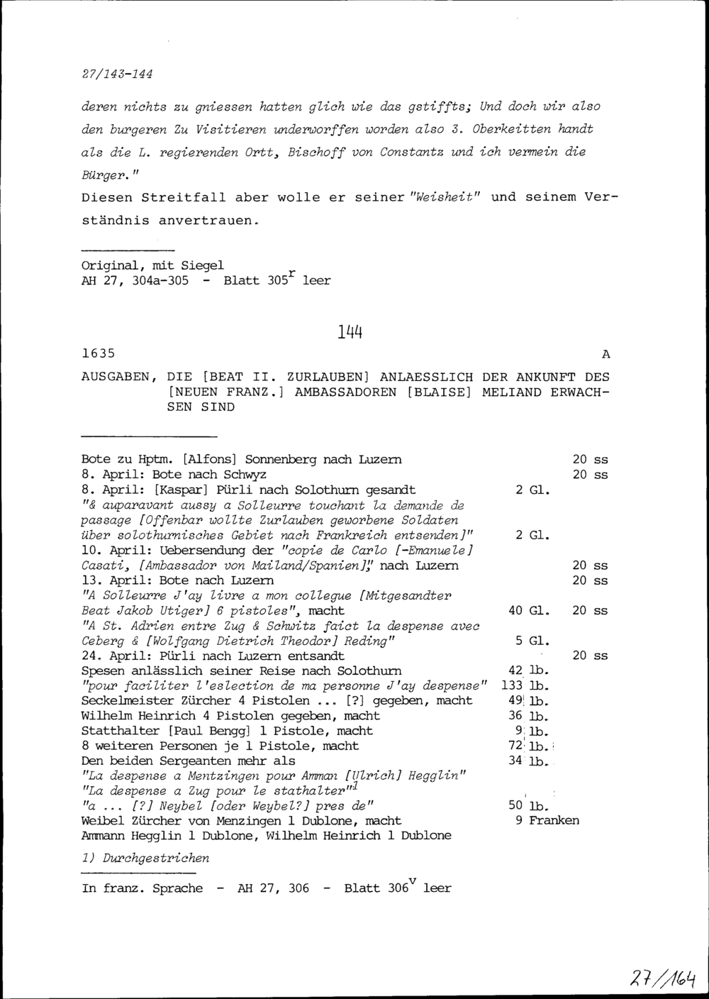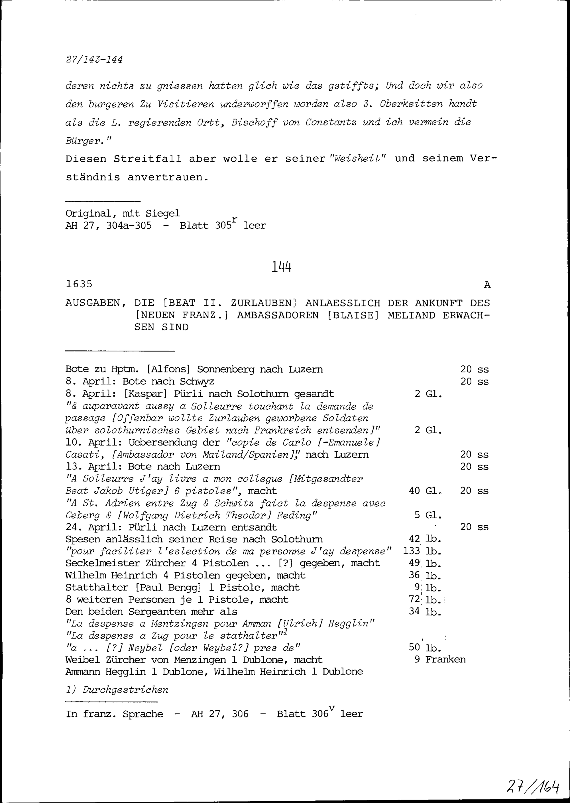Ausgaben, die Beat II. Zurlauben anlässlich der Ankunft von Blaise Méliand, neuer Ambassador von Frankreich, erwachsen sind