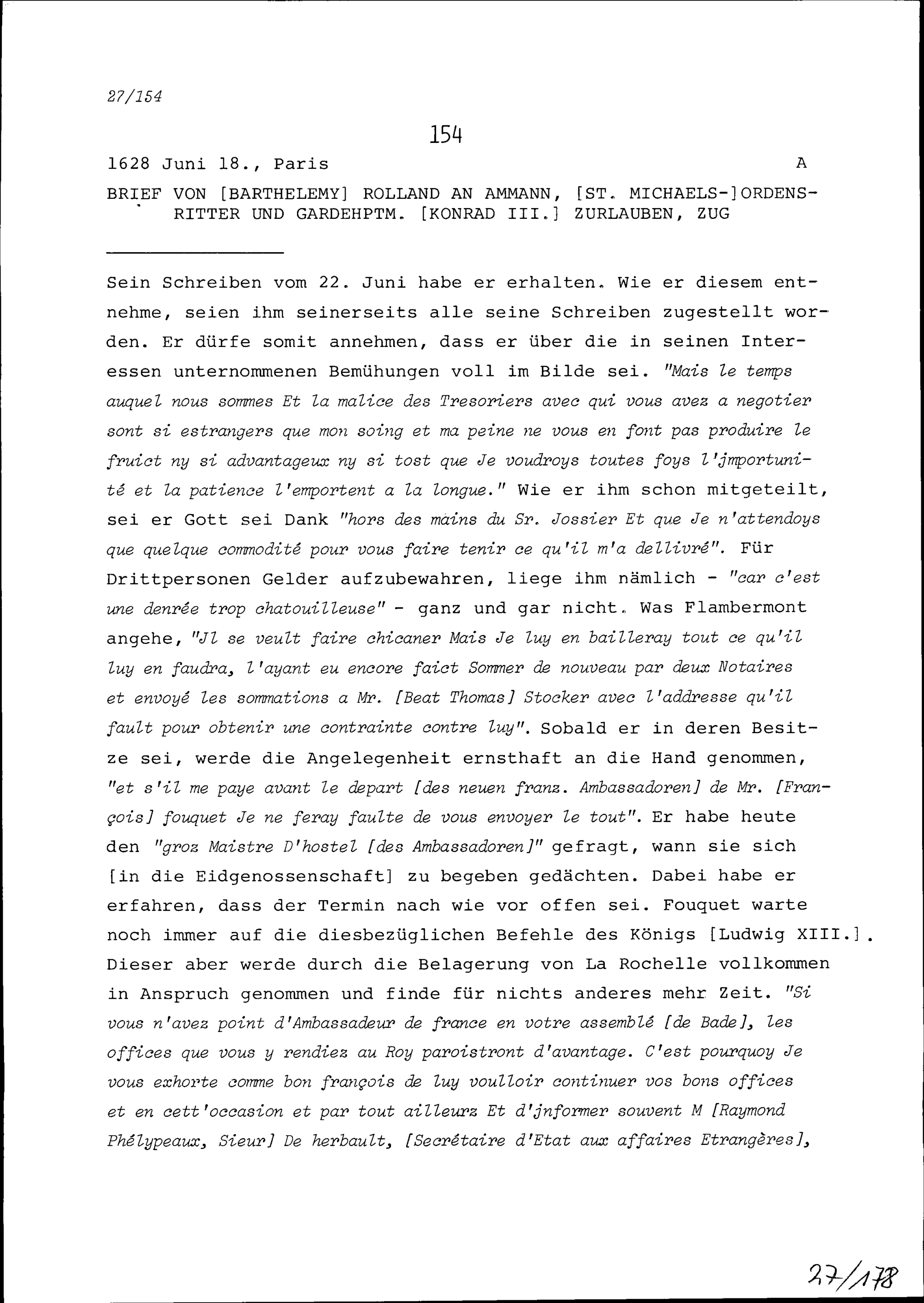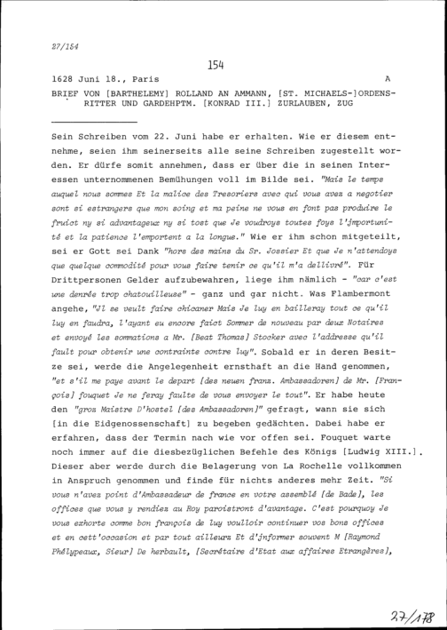 Schreiben von Barthélémy Rolland an Konrad III. Zurlauben, Ammann, Sankt Michaelsordensritter...