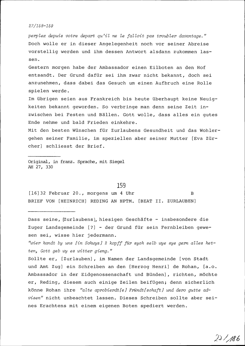 Schreiben von Heinrich Reding an Beat II. Zurlauben, Hauptmann