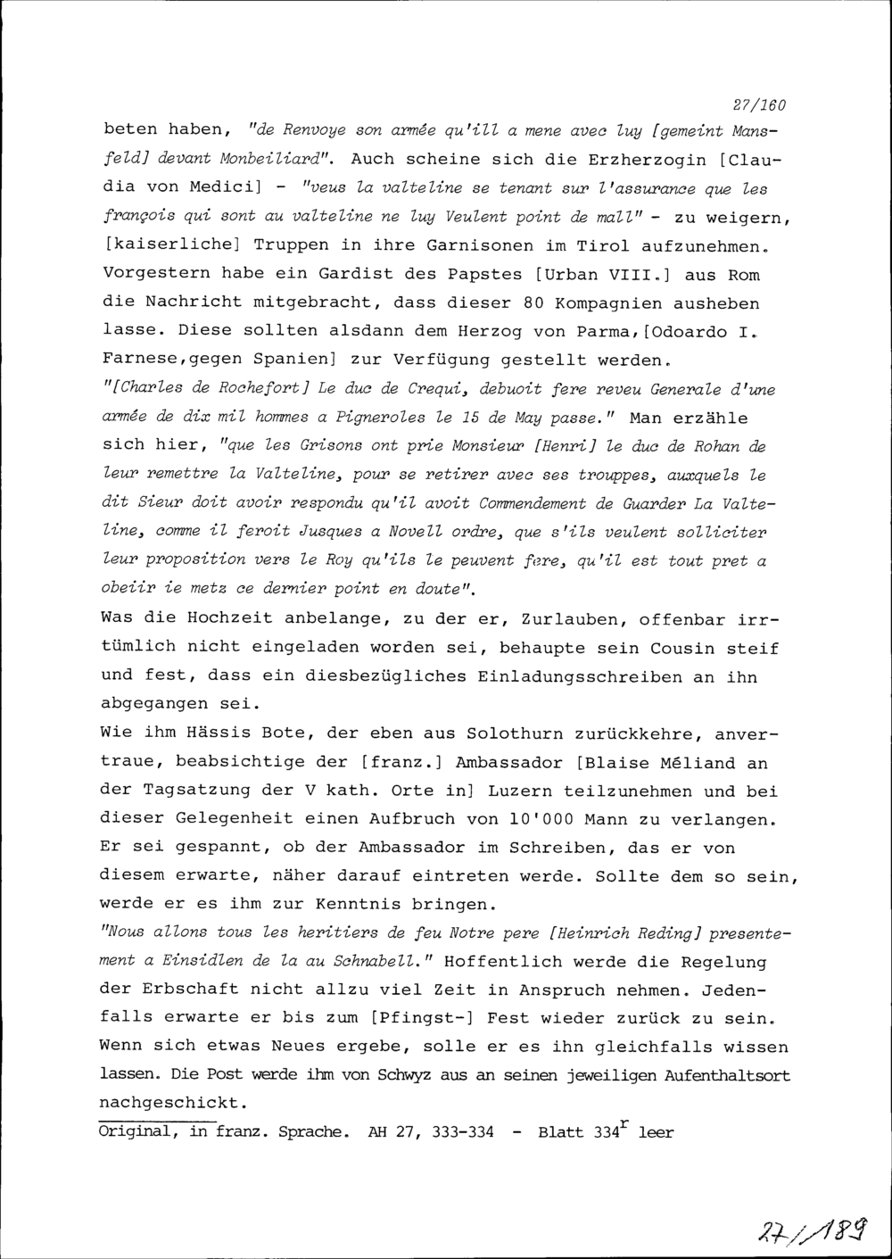 Schreiben von Wolfgang Dietrich Theodor Reding an Beat II. Zurlauben, Ammann und Gardehauptmann, Zug