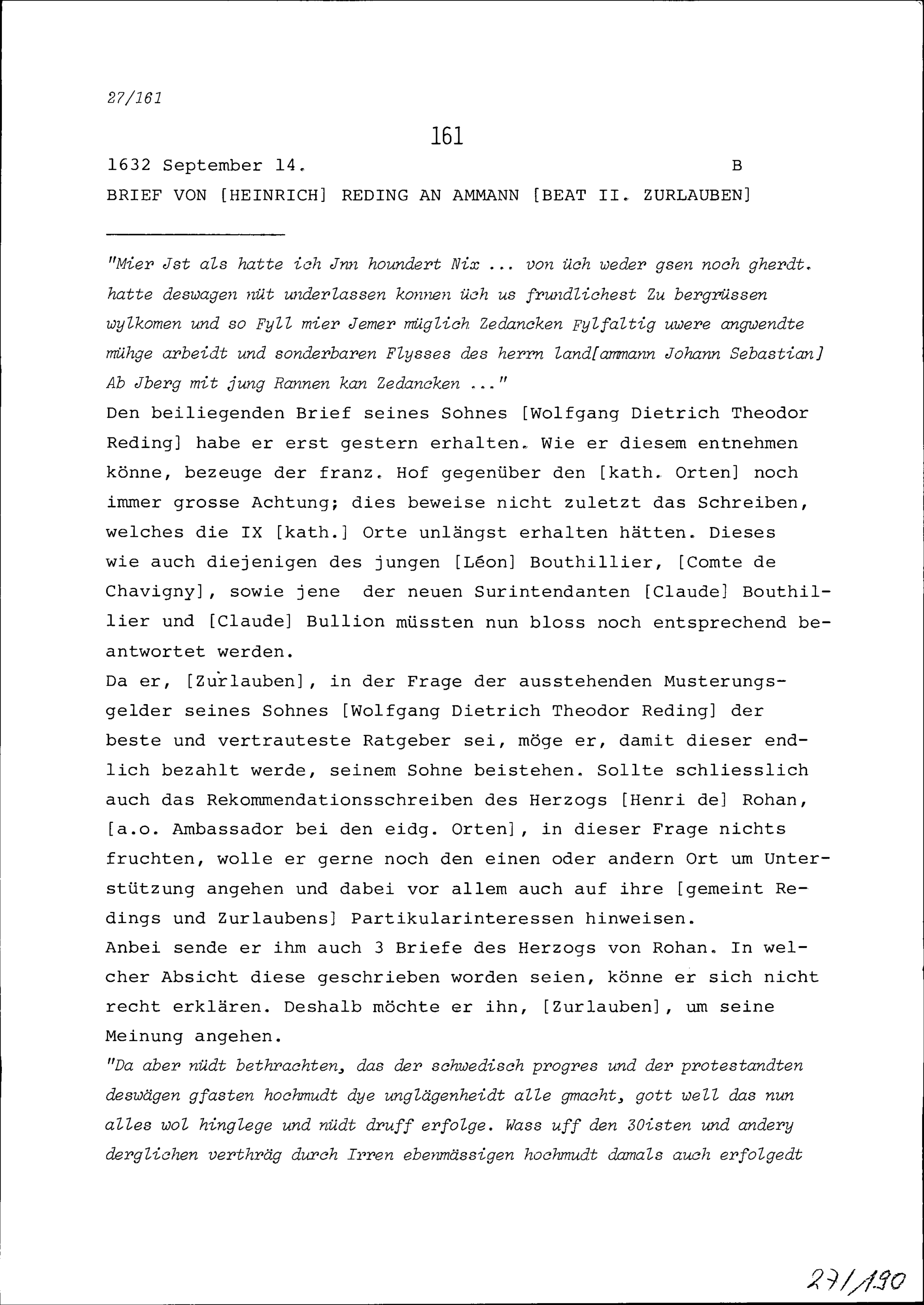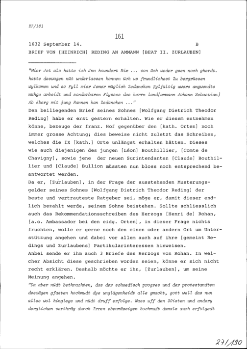 Schreiben von Heinrich Reding an Beat II. Zurlauben, Ammann