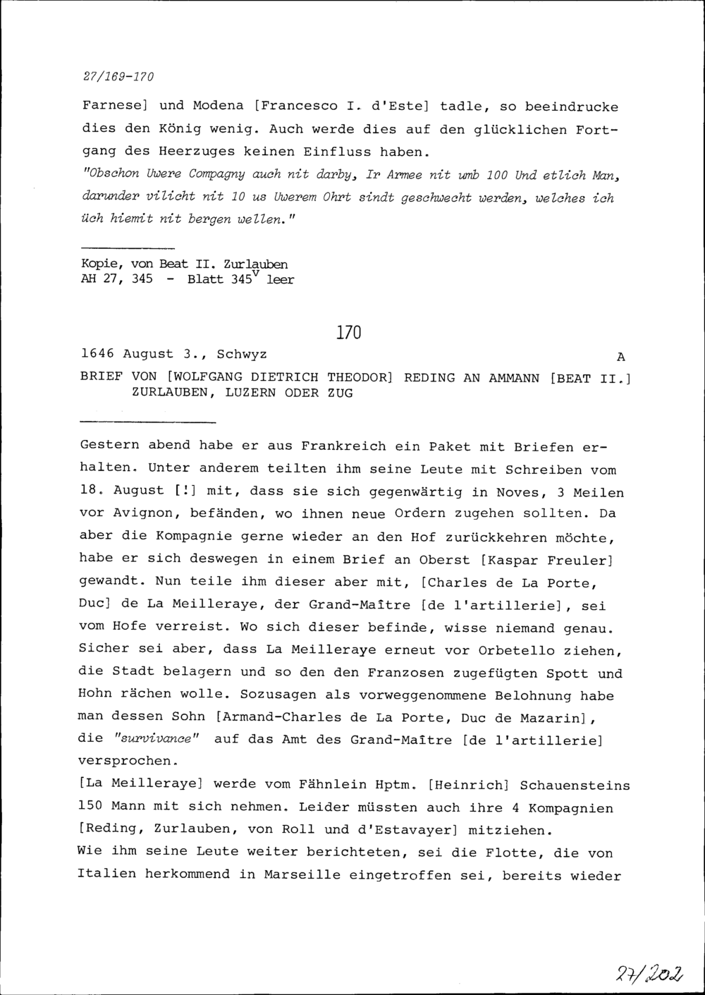 Schreiben von Wolfgang Dietrich Theodor Reding an Beat II. Zurlauben, Ammann, Luzern oder Zug